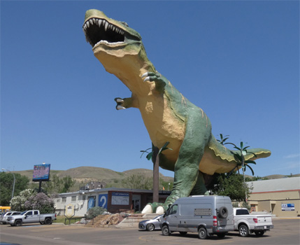 Bei Mercedes sind sie nicht begeistert, dass wir kommen, ohne einen Termin vereinbart zu haben. Dann erbarmt sich doch einer und hängt den Zerberus an den Diagnosecomputer. Es ist kein Fehler zu finden. Nach einem Reset funktioniert der Turbo wieder und nach ein paar Kilometern ist auch die Motorkontrollleuchte wieder weg. Vermutlich war also doch nur der nicht befestigte Luftschlauch des Schnorchels (böser Mechaniker in Toronto!) Schuld an den Troubles. Wieder mit voller Kraft geht es nach Rosedale, wo wir uns die Hoodoos genannten Sandsteinformationen und die Hängebrücke über den Red Deer River ansehen. Weil in der Region Dinosaurierskelette gefunden wurden, dreht sich in der Kleinstadt Drumheller alles um die Dinos. Sie stehen, naturfarben oder bunt, überall in der Stadt herum. Als besondere Attraktion gibt es hier die weltweit größte Dinosaurierattrappe, 46 Meter lang und 26 Meter hoch. Auch die Straßen sind nach verschiedenen Saurierspezies benannt. Der Red Deer River hat hier einen breiten Canyon gebildet, durch den wir fahren. Einmal führt die Straße zu einem Aussichtspunkt hinauf, dann wieder ins Tal hinunter. Mit einer kostenlosen Seilfähre überqueren wir den Fluss, der kaum doppelt so breit wie die Fähre lang ist. Der Fährmann führt Buch über beförderte Fahrzeuge und Personen. Heute hat er schon sechs Mal übergesetzt. Ein Traumjob! An einem weiteren Aussichtspunkt wollen wir campieren. Wir sitzen eine Weile in der Sonne, doch dann wird der Wind ungemütlich und wir fahren zurück nach Drumheller, wo wir im Stadtpark übernachten. Km 239/9.613/108.169.