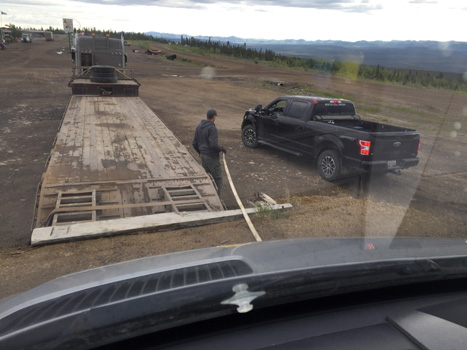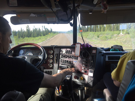 Beim Frühstück besprechen wir, was weiter geschehen soll. Dawson City ist zwar klein, aber es ist "nur" 400 Kilometer entfernt und es gibt dort sicher eine Werkstatt. Was die dort können und ob und wie schnell die Ersatzteile besorgen können, weiß man natürlich nicht. Die nächste Mercedes-Werkstätte befindet sich in Anchorage in Alaska, 1.200 Kilometer entfernt, aber als Fracht mit einem LKW über die Grenze ist bestimmt kein einfaches Unterfangen. Die nächsten Mercedes-Werkstätten in Kanada sind in Vancouver, Calgary und Edmonton, alle um die 3.000 Kilometer entfernt. Am einfachsten wird es vermutlich sein, den Zerberus nach Dawson zu bringen und dort einmal nachzusehen, was genau kaputt ist. Aber extra einen LKW kommen lassen ist sicher die teuerste Variante. Da versuchen wir zuerst, per Anhalter weiterzukommen. Die wenigen LKW, die hier vorbeifahren, bringen Güter nach Inuvik und fahren garantiert alle leer zurück. Ich möchte in Erfahrung bringen, wie viele LKW täglich hier vorbeikommen und wie man die anhalten könnte, denn es werden wohl nicht alle hier Station machen. Oder kann man die Trucker über Funk erreichen? Auf dem Weg zur Rezeption biege ich um eine Ecke und traue meinen Augen nicht: Da steht ein Laster mit einem riesigen Tiefladeranhänger. Und das Best ist: Er ist leer! Der Fahrer ist schnell gefunden, er kommt gerade aus dem Restaurant, wo er und seine Frau gefrühstückt haben. Ich erkläre ihm unsere Situation. Er sagt, er hat einen Baustellenlaster nach Inuvik gefahren und ist nun auf dem Weg zurück nach Edmonton. Da kommt er zwar nicht nach Dawson City, aber er könnte uns in Whitehorse absetzen oder gar bis Edmonton mitnehmen. Er muss aber mit seinem Chef telefonieren, was das kostet. In der Zwischenzeit packen wir überstürzt eine Tasche, denn es ist klar, dass wir auf der Fahrt nicht im Zerberus sein dürfen und in der Fahrerkabine kann kein Platz sein, denn außer dem Fahrer und seiner Frau sind auch noch zwei Hunde an Bord. Die Summe, die der Chef für den Transport bis Edmonton verlangt, ist zwar gemessen an der Strecke und verglichen mit dem gestern gehörten Preis recht günstig, wir müssen aber doch schlucken. Gord, so heißt der Fahrer, schlägt vor, dass wir zu einem Drittel des Preises vorerst bis Whitehorse mitfahren, da muss er dann ohnehin 36 Stunden pausieren. In dieser Zeit könnten wir vor Ort eine Werkstatt finden oder, wenn nicht, noch immer bis Edmonton mitfahren. Und er würde uns in seiner Kabine mitnehmen! Das klingt jedenfalls sehr vernünftig. Leider ist die Rampe des Anhängers nicht geeignet, um mit dem Zerberus raufzufahren, wir würden aufsitzen. Es gibt aber in der Nähe des Hotels eine Auffahrrampe, auf die man uns schleppt. Und schon hat uns Gord's Truck huckepack genommen. Wir nehmen uns Getränke, Futter und was zum Lesen mit und klettern in den Laster. Wir wollten ohnehin schon immer wissen, wie es in einer Schlafkoje eines LKW aussieht. Wir staunen, wie geräumig es ist. Gord und seine Frau Nadina sitzen natürlich vorne, zwischen ihnen liegen die Hunde Daisy und Duke und hinten nehmen wir Platz. Wir können sitzen oder liegen. Sehr gemütlich. Wir fahren etwa 12 Stunden lang mit drei halbstündigen Pausen. Obwohl wir uns mit den beiden gut verstehen und auch mit den Hunden Spaß haben, ist es ziemlich langweilig und wir sind froh, als wir um zehn Uhr in Whitehorse ankommen. Wir schlafen natürlch im Zerberus.