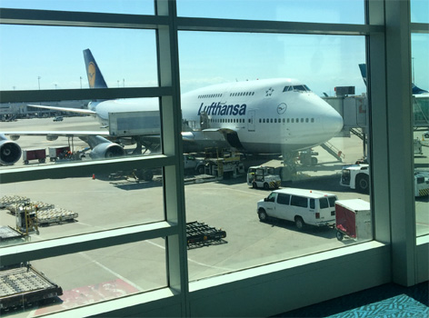 Wir packen unsere Taschen und machen das Auto sicherheitshalber frostsicher. Dann bringt uns der Shuttledienst von Mercedes zum Flughafen. Mit Air Canada geht es zunächt nach Vancouver, wo wir einen Jumbo Jet der Lufthansa besteigen. Da wir die Grönland-Route fliegen, die weit über den Polarkreis hinaus führt, und noch dazu Sonnenwende ist, geht die Sonne heute Nacht nicht unter. Es gibt fantastische Blicke auf die menschenleere Tundra. Die unzähligen Seen sind noch gefroren und schneebedeckt.