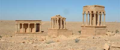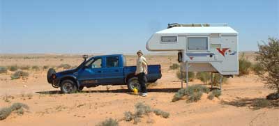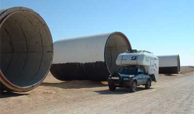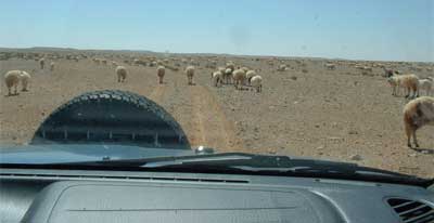 Libyen März 2003GMMR, Ghirza Donnerstag, 13. März 3 In der Nähe von Abu Grin fahren wir an einer Baustelle des GMMR-Projekts vorbei. Das "Great-man-made-River"-Projekt ist eines der teuersten Wirtschaftsprojekte weltweit und hat zum Ziel, fossile Wasservorkommen in der Sahara anzubohren und das kostbare Nass mittels Pipelines ca. 1.000 km nach Norden zu transportieren. Das Projekt ist nicht nur wegen seiner enormen Kosten umstritten, sondern auch, weil dieses fossile Wasser nur ca. 50 Jahre reichen wird. Und was ist dann? An oben erwähnter Baustelle werden uns die Dimensionen der Wasserleitungsrohre bewusst: Da könnte man mit einem Bus durchfahren! Vielerorts ist die Pipeline von einer befahrbaren Trasse begleitet. Unser nächstes Ziel ist Ghirza, das wir eigentlich von Norden über eine solche GMMR-Trasse ansteueren wollen. Da wir aber (im Nachhinein unbegründet) Angst haben, die Einfahrt auf die Trasse nicht zu finden, entscheiden wir uns zur Anfahrt von Abu Grin aus von Nordosten (Route A24 bei Göttler). 16 km südlich von Abu Grin biegen wir nach Westen ins Wadi Zemzem und erreichen nach ca. 33 km Fahrt auf schlechtem Asphalt dessen Ende. Hier beginnt eine Piste miesester Qualität und so entscheiden wir uns, in der Einöde die Kabine abzuladen und fahren dann 45 km Piste, unvorstellbar steinig - maximal 20 km/h, oft nur Schritttempo - durch die traurigste Einöde auf Erden. Es gibt nur mehr fallweise Tonnenmarkierungen zur Orientierung. Aber auch hier taucht dann und wann ein Hirte mit Schafherde auf. Dann endlich die GMMR-Trasse, auch hier schlechte, aber im Vergleich zum bisherigen, tolle Fahrbahn, 80-100 km/h sind doch möglich. Dann noch 8 km auf wieder übelster Piste mit 10-20 km/h. Ghirza ist ein Dorf mitten im Nichts, mit neuerbauten niedrigen Häusern und Strom. Auf der Fahrt durch das Dorf zum antiken Ghirza bemerken wir, dass wir verfolgt werden: Der Toyota bleibt uns hartnäckig auf den Fersen, versucht aber auch nicht, uns zu überholen. Nach ca. 3 km sind wir in Antik-Ghirza angelangt und unser Verfolger verkauft uns freundlich zwei Eintrittskarten zu je 3 LD und ein Fototicket zu 5 LD. Nur die üblichen 5 LD fürs Parken traut er sich doch nicht zu verlangen. Zwei Busse mit Franzosen haben auch den Weg hierher gefunden. Die römischen Mausoleen sind sehr eindrucksvoll, aber nur mehr sehr wenige Bauten sind erhalten. Haben sich die 6 Stunden hin und zurück gelohnt? Immerhin wars ein Abenteuer, das wir nur mit dem GPS bewältigt haben, ohne hätten wir kaum die Abfahrt von der Trasse, auf der wir dann die dahinkriechenden zwei Busse mit 100 km/h überholt haben, gefunden, kaum auch zurück zur Kabine. Die Wiedersehensfreude war groß. Wir fühlen uns schon zu Hause in dem Kastl. Dann ein kühles Bier und wieder Leberkäs (wie gestern), aber der läuft halt als erstes ab. Neulich gabs schon zweimal hintereinander Nudeln mit Sugo, weil die Glaserl das Vakuum durchs Rütteln verloren haben. Km 35.033 (273/2.111) Preise in Libyen