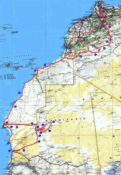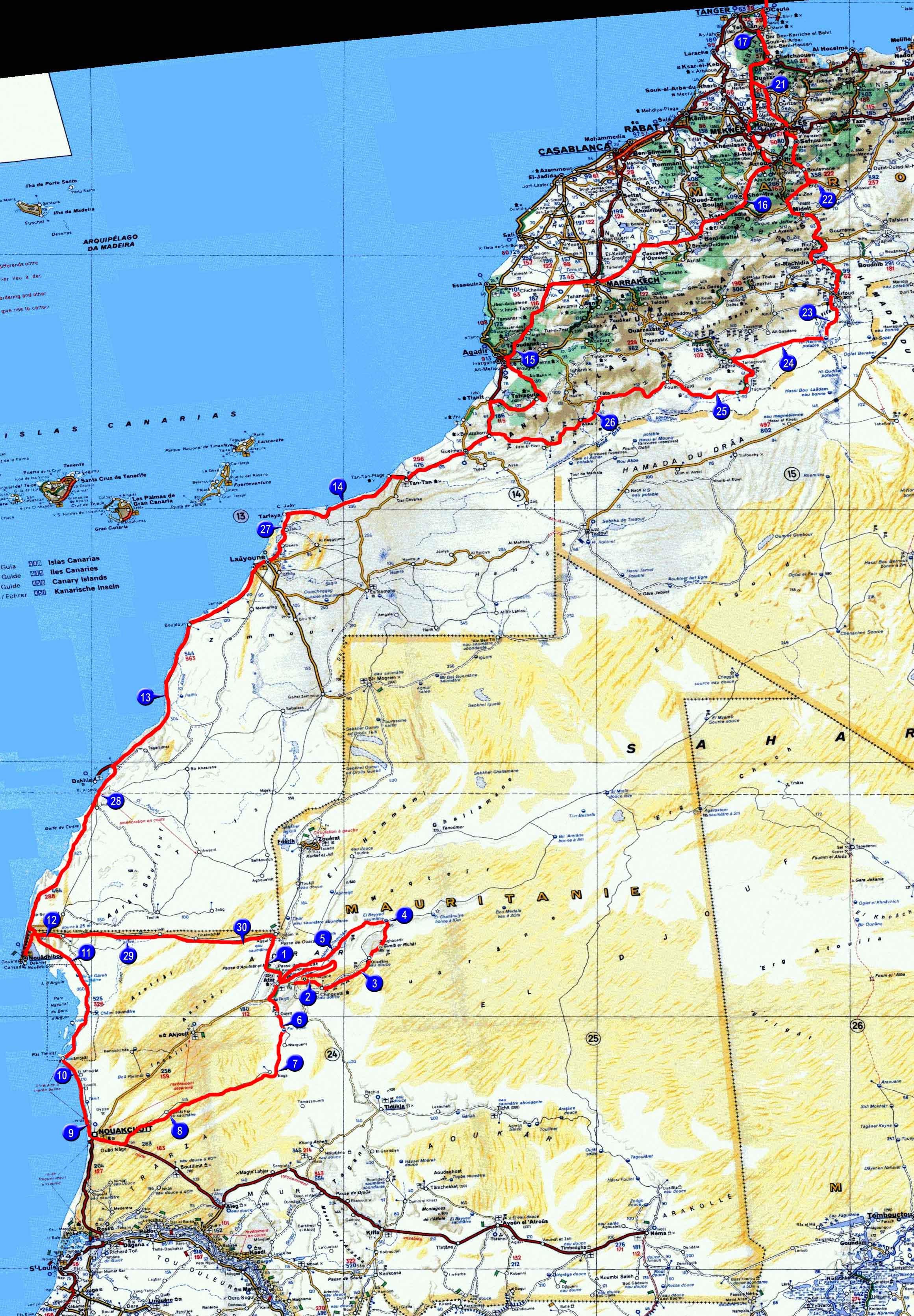 Mauretanien November-Dezember 2006 Unsere 14. Afrikareise führt uns nach Mauretanien. Diesmal reisen wir wieder ganz allein und erkunden die Saharagebiete des Landes. Auf der Anreise befahren wir auch die südmarokkanische Grenzregion zu Algerien. Die Landkarte lässt sich durch Anklicken vergrößern.