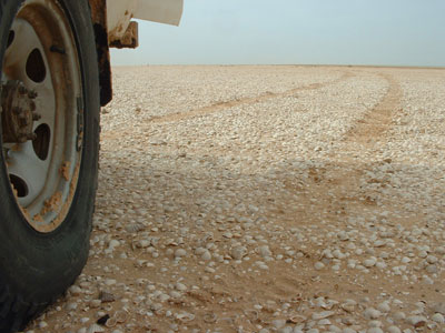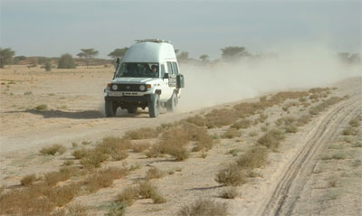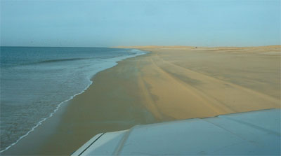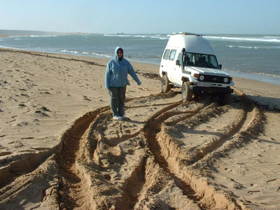 Montag, 11. Dezember 6, Tag 24 Was ist nur mit dem Wetter los? Zwar ist es weniger dunstig, aber wieder ganzen Tag windig, wenig sonnig und das Thermometer geht kaum über 20 Grad, einfach kein Badewetter. Nach kurzer Fahrt weiter am Strand kommen wir nach Nouamghar, wo der Nationalpark Banc d'Arguin beginnt. Im Parkbüro, vor dem zwei Wal"fisch"skelette liegen, lösen wir ein Ticket (2 Personen, 1 Tag 2.400 Ougya, ca. 8 Euro). Nun fahren wir gemütlich zunächst entlang der Küste nordwärts, doch es lassen sich nur wenige Tiere blicken: Möwen, Schwalben, einige wenige Pelikane, ein oder zwei Reiher, draußen am Meer fraglich zwei Delphine. Die Strände sind recht unsauber, überall liegt angespülter Müll und wir denken, dass man mit einem Teil der Eintrittsgelder die Strände säubern könnte. Da hätten viele Menschen Arbeit. Am Nachmittag will ich Diesel vom zweiten Tank in den ersten pumpen, doch es ist Luft in der Leitung und es funktioniert nicht. Das kommt manchmal vor, besonders wenn man abseits der Straßen unterwegs ist und es recht rüttelt. Man muss dann einfach den zweiten Tank volltanken, was die Luft aus der Leitung drückt. Doch die nächste Tankstelle ist noch gut 250 Kilometer weg und die Distanz schaffen wir mit dem Treibstoff, den wir im ersten Tank haben, nicht mehr. Ich frage daher im Camp von Tessot nach Diesel, worauf mir 20 Liter zum Preis von zuerst 500 (1,56 Euro), nach Verhandlungen um 400 Ougya (1,25 Euro) je LIter angeboten werden. Der Preis an den Tankstellen beträgt hingegen nur 235 Ougya (0,73 Euro). Ich lege mich daher kurzerhand unters Auto, schraube die Dieselleitung ab und blase Luft in den zweiten Tank, wodurch dort der Druck steigt und Diesel in die Leitung gedrückt wird. Nun können wir noch etwa 30 Liter umpumpen, womit wir leicht bis Nouadhibou kommen sollten. Im weiteren Verlauf entfernt sich die Piste durch den Park vom Meer und wir fahren durch gelegentlich von ein paar Dünen gesäumte unspektakuläre Ebenen. Km 220/8.083. |
