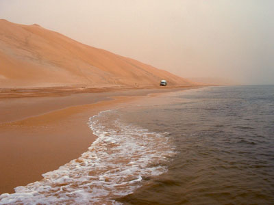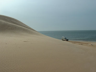 Sonntag, 10. Dezember 6, Tag 23 Schon in der Früh ist es bedeckt und dunstig, fast neblig. Und die frische Brise des Morgens wächst sich im Lauf des Tages zu einem Sturm aus. Der wunderschöne Küstenabschnitt, den wir heute befahren, lädt immer wieder zum Verweilen ein, da hier die Sanddünen direkt bis ans Meer reichen. Doch der Wind ist ungemütlich und bläst uns Sand in die Augen. Wir passieren mehrfach kleine Fischerdörfer, in denen die Fischer Netze flicken und die Boote bereit machen. Km 102/7.863.