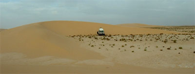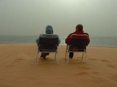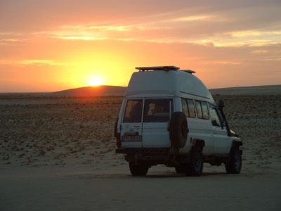 Dienstag, 12. Dezember 6, Tag 25 Nach Einbruch der Dunkelheit habe ich gestern noch die Leuchtweite unserer Scheinwerfer eingestellt, da wir ja bald wieder längere Strecken auf Asphalt fahren werden. Dabei habe ich bemerkt, dass beide Abblendlichter und ein Begrenzungslicht nicht funktionieren. Durchgerüttelt vermutlich. Heute Vormittag, während eines Stopps zum Reifenaufpumpen, wechsle ich die Birnen. Teils auf schlechter Piste, teils querfeldein hoppeln wir nach Norden, ohne dass irgendetwas besonderes zu sehen wäre, ausgenommen vielleicht das bei vielen Reisenden in diesem Gebiet bekannte Autowrack mit der Aufschrift "Bis bald in Gambia". Am frühen Nachmittag haben wir den Golf von Nouadhibou umrundet und die Asphaltstraße erreicht, auf der wir noch die paar Kilometer bis Nouadhibou fahren. Um die erste Tankstelle in der Westsahara zu erreichen, die etwa 60 Kilometer nach der Grenze liegt, tanken wir zehn Liter Diesel. Außerdem tanken wir Wasser, kaufen Brot und Datteln und halten eine ausgiebige Sitzung in einem Internetcafe ab. In unseren Mails lesen wir von Adventkaufrausch, Kälte und Schnee in Österreich. Irgendwie macht Heimfahren noch gar keine rechte Freude. Wir wünschten, wir könnten unseren Urlaub einfach noch um zwei Wochen verlängern und erst nach Neujahr zurückkommen. Doch leider, zu Hause ruft die Pflicht. Km 198/8.281. |