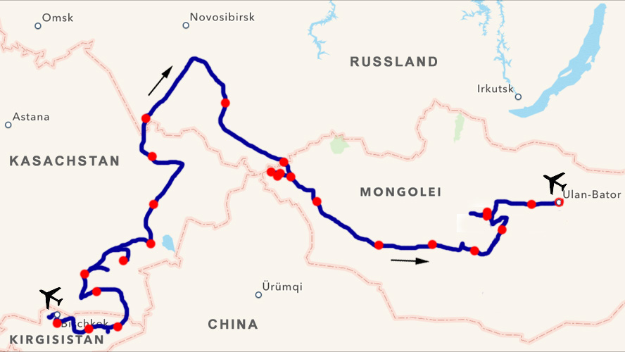 Zur Erinnerung: Wir sind im April/Mai mit dem Zerberus, unserem Mercedes-Sprinter-4x4-Wohnmobil, von Österreich aus in den Iran und von dort über Usbekistan und den Pamir-Highway nach Kirgistan gefahren. Die zweite Etappe unserer Weltreise startet am 11. Juli. Sie führt zunächst von Bishkek in Kirgisistan am Südufer des Issykul-Sees entlang durch das Tien-Shan-Gebirge. Vorbei am Sharyn-Canyon, dem Grand Canyon Zentralasiens, geht es nach Almaty, der größten Stadt Kasachstans; durch weite Steppen gelangen wir ins kasachische Altai. Um in die Mongolei zu gelangen müssen wir einen etwa 1.200 Kilometer langen Abstecher nach Russland machen, der uns bis in die sibirische Stadt Barnaul führt. In der Mongolei möchten wir uns zunächst ausgiebig dem Altai-Gebirge widmen, bevor wir unsere Reise für 4 Wochen unterbrechen. Nach dieser Pause geht es in den Süden der Mongolei, in die Gobi. Mein Dank gilt Familie McFall in Bishkek, Vait Scholz von Steppenfuchs-Reisen in Ulaanbaatar, Helmut Schrenk, Engelbert Kohl, meinen Kollegen vom ÄND, die mir mit Diensttausch sehr geholfen haben, weiters Resi, Eva und Michaela und nicht zuletzt Susi, deren unendliche Liebe uns diese Reise überhaupt ermöglicht. Danke auch allen, die uns schreiben.