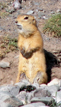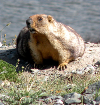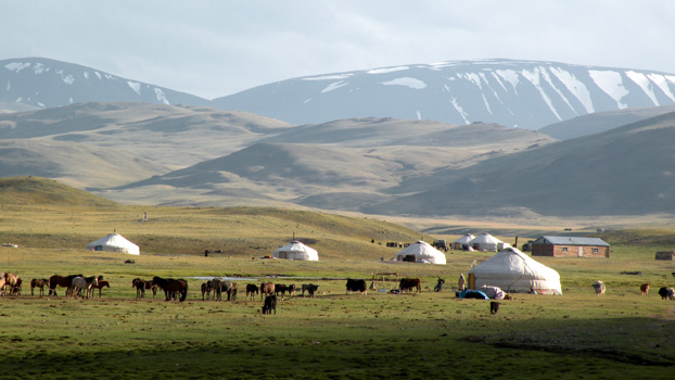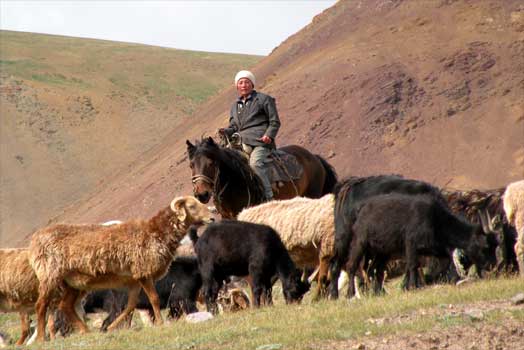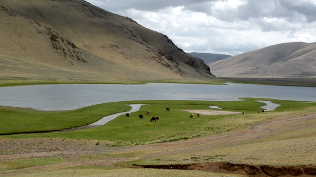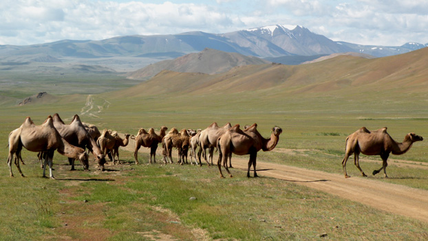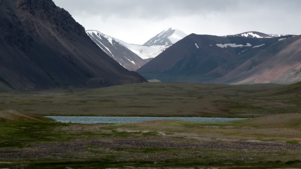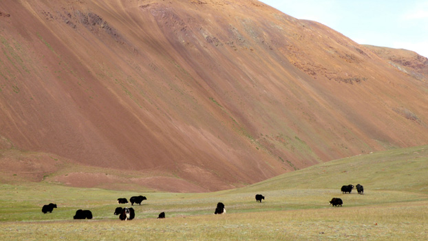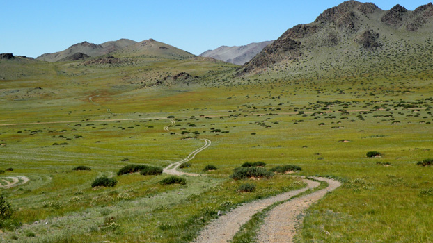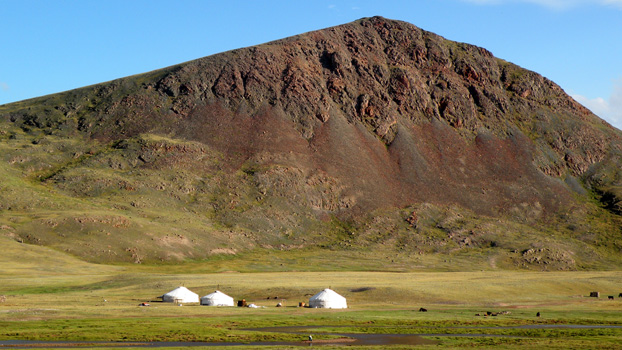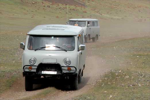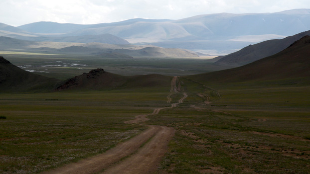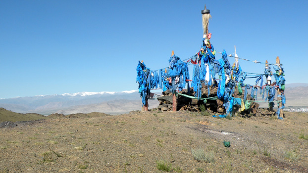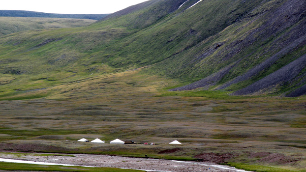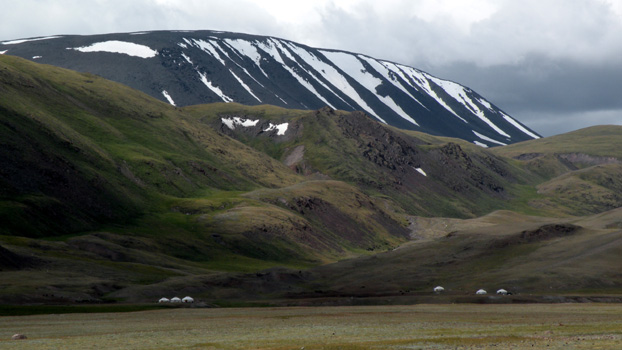 Heute Nacht war's irgendwie kalt. Das ist auch kein Wunder. Denn wir haben versehentlich die Hecktüre einen ordentlichen Spalt offen gelassen. Wir holen die Permits ab, die natürlich nicht, wie versprochen, um 10, sondern erst um kurz vor 11 da sind. In der Zwischenzeit tanken wir Wasser. Das teuerste Wasser übrigens, das wir jemals in unseren Zerberus gefüllt haben. Blue Wolf Travel ist schließlich eine Reiseagentur und kein Wohltätigkeitsverein. Und los geht's ins Altai! Da uns keine vernünftigen Landkarten zur Verfügung stehen, habe ich schon zu Hause bei Google Earth Routen gesucht, aber ab Tsagan Ereg Uul war der Verlauf der Wege bis zum Tavan-Bogd-Basislager nicht mehr zu erkennen. Der Tavan-Bogd mit seinen gut viertausend Metern befindet sich im Schnittpunkt der Grenzen zwischen Russland, China und der Mongolei. Wir haben uns vorgenommen, umzudrehen, falls die Orientierung unklar wird oder die Piste zu schlecht. Der Weg führt durch eine grandiose Gebirgslandschaft, es ist überall grün, es gibt kaum schroffe Kanten, sondern es überwiegen weiche Konturen, und schließlich tun sich immer wieder weite Blicke in Täler oder Ebenen auf. Anfangs gibt es ziemlich viel Wellblech und wir kommen nur mühsam voran, doch dann wird der Weg besser und wir erreichen am Abend Tsagan Ereg Uul, wo sich ein Zwei-Mann-Militärposten befindet. Hier wird unser Permit einbehalten und ein neues ausgestellt. Welch Bürokratie! Gelegentlich passieren wir Gruppen von Jurten, oft an Bächen oder an kleinen Seen gelegen. Viele Schafe, Ziegen, Pferde, Kühe und Yaks grasen. Die Tiere sind unbeaufsichtigt auf Weide, oft weit weg von zu Hause, sie kehren aber am Abend selbständig zurück, wo sie gemolken werden. Vereinzelt sehen wir auch Wildtiere, sehr viele Murmeltiere aber auch Erdhörnchen, Reiher, Falken. Unser heutiger Nachtplatz liegt auf 2.540 Metern, nur 9 Kilometer von der russischen Grenze entfernt. Sabine duscht bei 8 Grad, ich kann mich nicht dazu entschließen. Erfreulicher Weise funktioniert unsere Heizung, die ja auf der ersten Etappe reichlich Probleme gemacht hat, einwandfrei. Km 169/4.369/21.513.