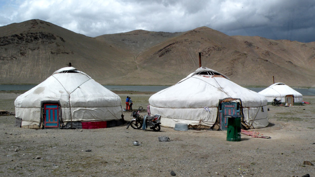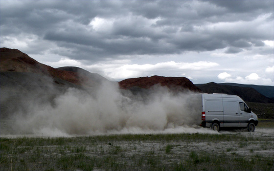 Sabine ist krank. Sie liegt mit einer schweren Bauchgrippe. Sie besteht aber darauf, dass wir weiterfahren. Bald, etwa 20 Kilometer vor dem Tavan-Bogd-Basislager, erreichen wir wieder einen Kontrollposten, bei dem man uns nicht weiterfahren lassen will, weil wir nicht das richtige Permit mithaben. Sie wollen jenes, das die Soldaten gestern Abend einbehalten haben. Da es außerdem nach einem Schlechtwettereinbruch aussieht, ist es vermutlich ohnehin das beste, umzudrehen und nicht zu versuchen, die Leute umzustimmen. Wir fahren ein Stück zurück und legen einen Genesungstag ein. Durch eine Delle am Felgenrand eines Rades pfeift Luft aus. Erfreulicher Weise lässt sich die Delle ganz gut ausklopfen und der Reifen ist wieder dicht. Am Abend fahren wir weiter zurück nach Tsagan Ereg Uul, wo ich die Dienststelle der beiden Soldaten stürme. Ich will mein Permit, denn das brauchen wir vermutlich auf unserer Rundfahrt nochmals. Der Überraschungsangriff gelingt, die beiden sind total perplex und rücken wider Erwarten den Wisch raus. Km 56/4.425/21.569.