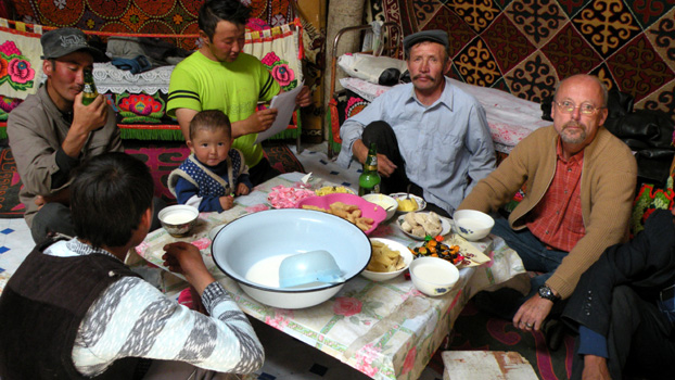 Zwischen russischer und mongolischer Grenzstelle sind zirka 30 Kilometer zurückzulegen. Auf mongolischer Seite erfolgt zunächst eine sinnlose Fahrzeugdesinfektion, wofür man 100 Rubel (2 Euro) kassiert. Nach der Passkontrolle wird es spannend: Wird der mongolische Zoll mein Carnet abstempeln? Oder werden hier schon Schwierigkeiten bei der Ausreise in zwei Wochen ohne Auto vorprogrammiert? Ich bin überrascht, denn es scheint keinerlei Problem zu sein, das Auto für eine Weile in der Mongolei stehen zu lassen. Der Zöllner lässt sich zeigen, wo er das Carnet abstempeln muss, und trägt nicht einmal eine Frist ein, bis zu der das Auto wieder aus dem Land muss. Eine Autoversicherung kostet 25 Euro. Alles in allem dauert die Grenzabfertigung an beiden Seiten zweieinviertel Stunden. In der Nähe von Zagaanuur wohnt eine Familie, der wir einen Gruß von Gertrude und Helmut bestellen sollen. Auf Grund der genauen Ortsbeschreibung finden wir die Gruppe von Jurten auf Anhieb. Aber erst die dritte Jurte, die wir aufsuchen, ist die richtige. Der Besuch in einer Jurte ist ein unvergessliches Erlebnis. Es ist erstaunlich, wieviel Platz darin ist. In der Mitte befindet sich der Ofen, linker Hand sind Betten aufgereiht und rechts ist quasi der Wirtschaftsraum; hier hängt auch das Fleisch zum Trocknen. Wir werden in jeder Jurte aufs herzlichste empfangen, es wird reichlich aufgetischt und wir müssen allerlei Eigenartigkeiten essen und trinken. Wir steuern ein paar Bier und Zuckerl für die Kinder bei. Und es kommen immer mehr Leute herein, um uns zu sehen. Obwohl wir einander sprachlich nicht verstehen, haben wir Spaß mit den Leuten. Es ist richtig gemütlich. Beim Abschied, als wir schon im Auto sitzen, werden wir noch nach Wodka gefragt. Ich reiche zwei Schnapsgläser mit Obstler aus dem Fenster, der den Männern die Tränen in die Augen treibt. Bald sind wir in Ölgii, wo wir Geld wechseln und nach langem Suchen die Reiseagentur Blue Wolf Travel finden (N48 57.843 E89 57.936; die haben ihren Standort auf ihrer eigenen Homepage falsch eingezeichnet!), die uns bis morgen die Permits für die grenznahen Altai-Gebiete besorgen soll. Km 148/4.199/21.344.