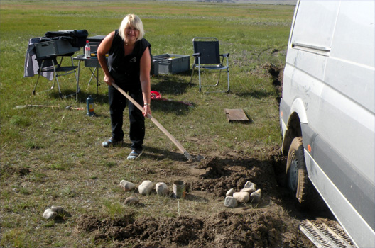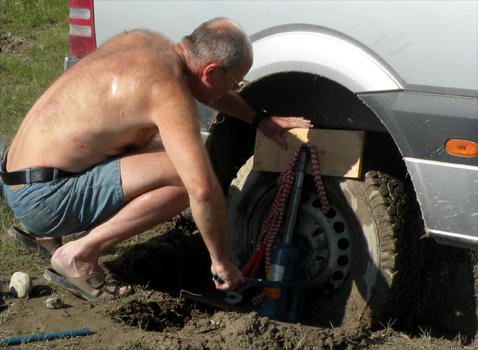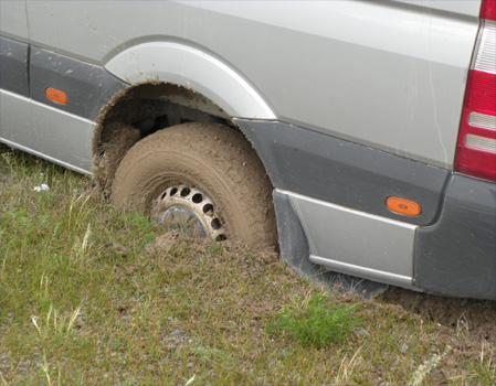 Ausgeschlafen und mit neuem Elan starten wir die Bergung, die durch tausende stechende Mücken erschwert wird. Zudem befinden wir uns in zirka 2.500 Metern Höhe und ich bin nach kleinsten Anstrengungen außer Atem. Zuerst entladen wir unser Auto. Dann heben wir mit dem Wagenheber und einem Abschleppseil abwechselnd das linke und das rechte Hinterrad hoch, füllen den Freiraum mit Steinen und lassen den Wagen wieder nieder, der dann die Steine in den Boden drückt, aber doch einen oder zwei Zentimeter höher steht als zuvor. Das Verfahren wiederholen wir unzählige Male, bis es gegen Mittag endlich gelingt, den Zerberus aus dem Dreck zu fahren. Die Freude ist groß, aber die Erschöpfung nicht minder. Wir sind echt fertig. Als wir gerade beim Einräumen des Autos sind, kommt ein Reiter vorbei, der uns einen trockenen Weg zeigt. Wir folgen ihm, bis er uns anweist, durch einen Fluss zu fahren. Der ist zwar nur kniehoch, aber die Strömung ist stark und wir entscheiden, hier nicht durchzufahren. Der Reiter lässt uns beleidigt stehen. Wir suchen nach weiteren Wegen, landen aber jedes Mal vor Fluss oder Matsch. Wir beschließen, umzudrehen und auf unserer eigenen Spur bis Zagastnuur zurückzufahren, wo auf allen Landkarten die Straße den Fluss quert. Dort muss es also eine Brücke oder eine gute Furt geben. Als wir alle Feuchtgebiete hinter uns haben, machen wir Rast für ein verspätetes Mittagessen und verbringen zwei Stunden mit der Reinigung unserer Ausrüstung und einer kalten Dusche. In Zagastnuur müssen wir feststellen, dass auch hier der Fluss unüberwindlich ist. Also nochmals kehrt: Wir fahren via Hohotol zurück nach Ölgii. Km 129/4.697/21.841.
