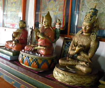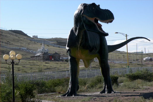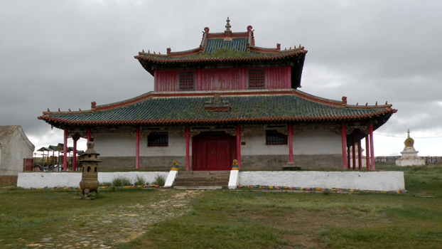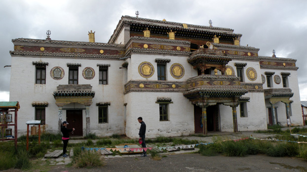 In der Früh repariere ich den kaputten Reifen; obwohl der Klebstoff nicht mehr flüssig ist, gelingt es. Dann wieder Rüttelpiste. Während ich heute recht entspannt bin, hat Sabine heute die Nervenkrise. Die Piste setzt aber auch anderen zu: Nirgendwo sonst haben wir jemals so viele Fahrzeuge mit Pannen am Straßenrand stehen gesehen wie hier. Einer Familie, bei deren Klein-LKW der Federbolzen abgebrochen ist, helfen wir mit einem zweiten Wagenheber aus. In Bumbugur nehmen wir in einem sehr einfachen Lokal ein obensolches Mittagessen ein: frittierte und mit Hackfleisch gefüllte Teigtaschen. Bei einer Nachmittagsrast repariere ich die schon lange klappernde Tür in den Kofferraum. Welch Wohltat auf der Weiterfahrt: Ein Klappergeräusch weniger! Am Abend erreichen wir Bayankhongor, wo wir uns neben dem Dino-Park den recht beeindruckenden buddhistischen Tempel ansehen. Km 214/5.909/23.052.