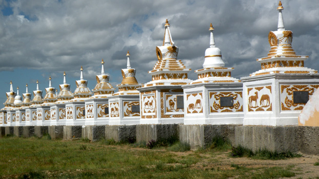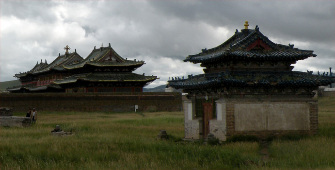 Regen verwandelt die Staubpiste in eine Matschpiste. Das Fahren erfordert höchste Konzentration, um nicht stecken zu bleiben. Am frühen Nachmittag sehen wir uns das alte Kloster Shank an. Der Tempel ist versperrt, aber es gelingt, einen unmotivierten Mönch zum Aufsperren zu bewegen. Bis Kharkhorin, dem ehemaligen Karakorum, ist es nicht weit und wir besichtigen die sehr beeindruckende 400 mal 400 Meter große Tempelanlage Erdene Zuu mit mehreren noch gut erhaltenen Tempeln und über 100 Stupas. Als wir in einer der Imbissstuben vor der Anlage unser Abendessen einnehmen, bekommt die Wirtin frische Ware geliefert: Eine ganze Ziege, abgezogen und ausgenommen, wird auf dem Nebentisch abgelegt. Km 206/6.367/23.509.