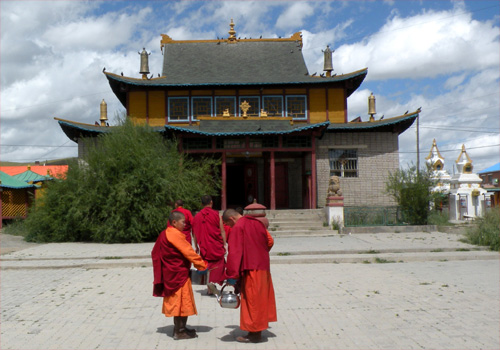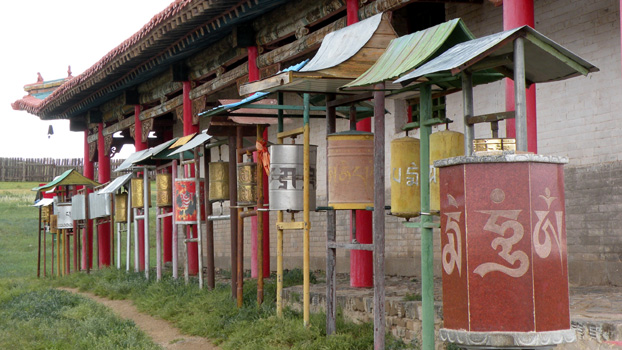 Um Tsetserleg sehen wir erstmals in der Mongolei Wälder. Tsetserleg selbst mit seinen bunten Dächern erstreckt sich auf zwei gegenüberliegende Hänge und ist ein hübscher Anblick. Wir besichtigen das frühere Kloster Zayaiyn Khuree, das heute als Museum dient, und steigen dann zu einem anderen auf einem Hügel gelegenen Kloster hoch und genießen den Blick auf die Stadt. In einem weiteren Kloster unweit des Museums beobachten wir mit großem Staunen Mönche und Gläubge. Mehrere Mönche sitzen auf Bänken und beten jeder laut vor sich hin. Der Raum ist von einem Stimmengewirr erfüllt, Glocken werden geläutet (Kostprobe). Die Gläubigen sitzen teils auf Bänken im hinteren Teil des Gebetsraumes, teils auf Stühlen den Mönchen gegenüber. Manche übergeben den Mönchen ein Papier, auf dem vermutlich steht, wofür gebetet werden soll. Die Mönche beten während sie lesen, ein Pulver auf das Papier streuen, es falten, Essen von unter dem Tisch hervorholen, sich ein paar Bissen in den Mund schieben, ein SMS schreiben. Die Gläubigen kommen und gehen, manche bringen Essen für die Mönche mit. Wir essen in einem stilvollen Restaurant im Zentrum, das uns mit Foto-Speisekarte überrascht. Leider sind die allermeisten Gerichte nicht verfügbar. Wir fahren zurück Richtung Kharkhorin, biegen aber am Rand des Orkhon Valleys nach Norden ab, um nach Khar Balgas, der schwarzen Stadt (8. Jahrhundert), zu gelangen. Leider kommt uns ein Nebenarm des Orkhon in die Quere und wir müssen ein ordentliches Stück zurückfahren, bis der Arm so seicht ist, dass wir ihn durchfahren können. Km 216/6.582/23.725.