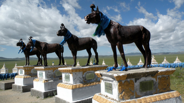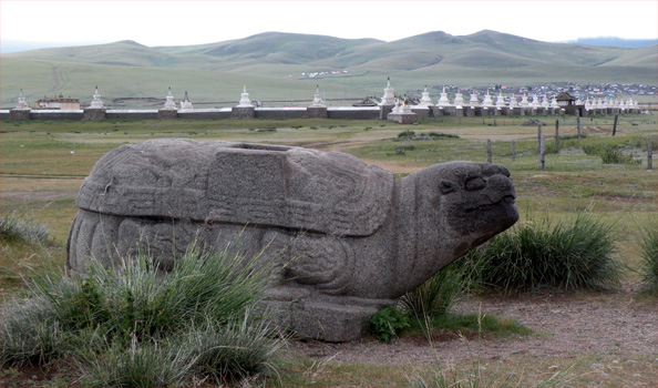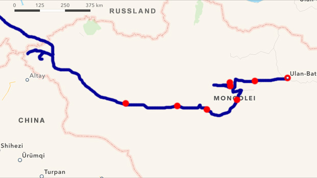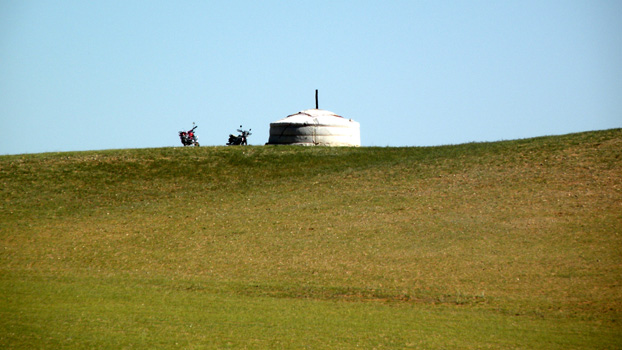 Khar Balgas (N47.43275 E102.65782) ist enttäuschend. Zwar arbeitet ein deutsch-mongolisches Archäologenteam an der Ausgrabung der Zitadelle, doch gibt es außer dem Wall der Stadt praktisch nichts zu sehen. Via Kharkhorin geht es auf guter Asphaltstraße nach Koshoo Taidam (N47.56022 E102.84180), eine alttürkische Gedenkstätte aus dem 8. Jahrhundert. Auch sie ist unspektakulär. In einem Camp (47.751477°102.791903°) am Ogii Nuur essen wir zu Mittag. Das Ambiente ist nett, aber die Speisen sind hochpreisig, die Wartezeit auf's Essen lang, die Portionen zwar nett angerichtet, aber winzig, der Fisch kommt nicht aus dem See, sondern aus der Tiefkühltruhe und der Fernseher kann nur mit drastischen Methoden dauerhaft außer Betrieb gesetzt werden. Eigentlich hätten wir Lust auf ein Bad im warmen See, doch wegen der vielen Kühe und Pferde, die im See stehen und das Wasser verunreinigen, lassen wir es bleiben. Auf Asphalt geht es Richtung Ulan Bator. Kurz vor Lun übernachten wir am Rande eines reichlich bewachsenen Sanddünenfeldes. Seit unserer Abfahrt von zu Hause im April haben wir heute 90 Längengrade passiert, ein Viertel der Erde umrundet! Km 280/6.862/24.005.