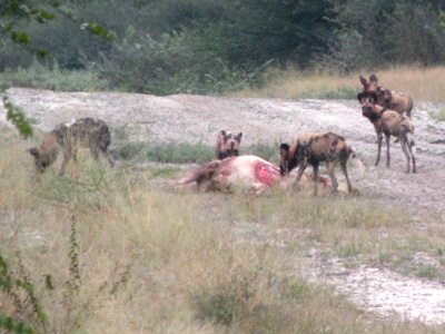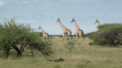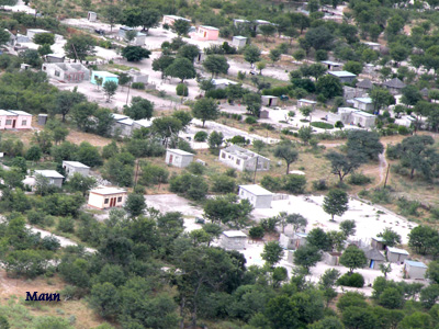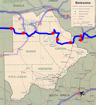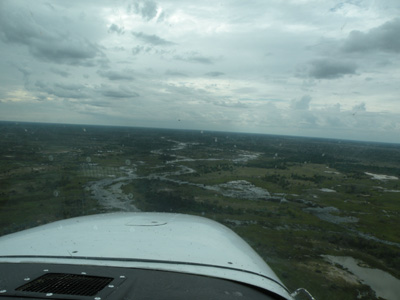 Freitag, 22. April 11, Tag 6, Maun Obwohl es in der Nacht nicht geregnet hat, ist draußen alles feucht. Der Himmel ist von sehr tief stehenden Wolken bedeckt und wir sind bedrückt, weil es bei dem Wettter nichts wird mit einem Rundflug über das Okavango-Delta. Im feuchten Sand sind zahlreiche frische Elefantenspuren zu sehen, auch sehr nah an unserem Auto. Erfreulicherweise haben die vorbeiziehenden Dickhäuter in der Nacht keinen Krach gemacht und uns nicht geweckt. Heute pendelt unsere Tachonadel schon bei stehendem Auto zwischen 80 und 120 und nach kurzer Fahrt fällt sie auf Null. Dabei handelt es sich um ein bekanntes Problem unseres Buschtaxis, eine Altlast aus dem Senegal 2005. Da hat ein ungeschickter Mechaniker das Kabel des Tachoabnehmers abgerissen und nur notdürftig repariert. In der Folge machte der Tacho manchmal Macken, wenn das Buschtaxi unten nass wurde. Seit ich allerdings einen Batzen Fett auf die Steckverbindung geschmiert hatte, funktionierte alles wieder einwandfrei. Zunächst geht es noch etwa 30 Kilometer auf der Piste weiter bis zur Asphaltstraße Shakawe-Sehitwa. Plötzlich sehen wir auf dem Weg Hyänen, die die Flucht ergreifen, als sie uns sehen. Sie haben ein Kalb gerissen und gerade ihre Mahlzeit begonnen. In einiger Entfernung verstecken wir uns hinter einem umgestürzen Baum und sehen zu, wie alle außer einer, dem Aufpasser, ihr Frühstück fortsetzen. Während wir auf der Asphaltstraße nach Sehitwa und weiter nach Maun fahren, lichtet sich die niedrige dunkle Wolkenschicht und gibt eine hohe aufgelockerte Bewölkung frei. Wir machen uns Hoffnung. Da in Maun zwei Bankomaten kein Geld hergeben, wechseln wir einen kleinen Betrag in einer Wechselstube zu sehr schlechtem Kurs, wir werden, wo es geht, mit der Kreditkarte bezahlen. Nach Einkauf, Internet und Tanken erfreuen wir uns in einem Chicken-Restaurant an einem unterernährten Huhn. Dann fahren wir zum fast im Stadtzentrum gelegenen International Airport und finden auf Anhieb eine Agentur, die uns praktisch sofort einen Flug über das Okavango-Delta ermöglicht. Mit der Cessna 172 mit dem treffenden Kennzeichen A2-SKY fliegen wir in einer Höhe von 4.600 Fuß zunächst etwa 40 Meilen nach Norden, dann die gleiche Strecke nach Westen und wieder nach Maun zurück. Wir sehen zunächst, dass die Stadt weit größer ist, als wir gedacht haben. Dann geht es über Sümpfe, Flussläufe, Seen und Tümpel. Dazwischen grüner Busch, Palmen, vereinzelt Hütten, Pferche, die eine oder andere Lodge mit eigenem Airstrip. Vielfach sind Wege erkennbar, doch sie sind überschwemmt oder erkennbar aufgeweicht. Außer ein paar Elefanten und Gazellen sehen wir aus der Luft keine Tiere, sie sind jetzt am Ende der Regenzeit weit verstreut, da praktisch überall Wasser zu finden ist. Erst zur Trockenzeit trifft sich hier wieder alles.