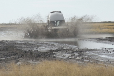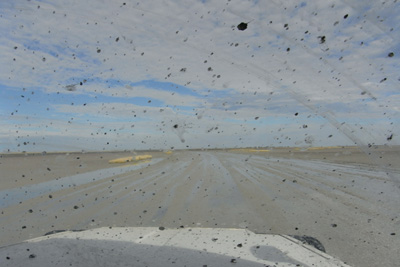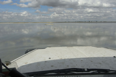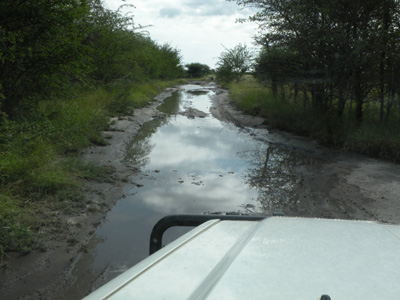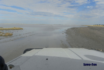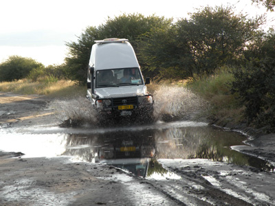 Ostermontag, 25. April 11, Tag 9, Sowa-Pan Als wir bei Sonnenaufgang aufstehen, sind die meisten unserer Nachbarn bereits abgefahren. Da wir hingegen nicht auf der Flucht, sondern im Urlaub sind, verabschieden wir uns von diesem schönen Platz mit einer langsamen Rundfahrt um die Insel. Wir verlassen Kubu-Island über die Südzufahrt durch die Sowa-Pan, die trotz des Regens der letzten Tage befahrbar, allerdings "wet" sein soll, wie uns der Ranger gestern sagte. Anfangs geht es ein Stück auf trockenem Sand, doch bald führt die Spur in einen See. Das Wasser steht allerdings maximal 20 Zentimeter und ist einigermaßen klar, sodass man die Fahrspur immer sieht. Die Durchfahrt ist vielleicht 300 oder 400 Meter lang, dann geht es durch Schlamm. Bald erkennen wir, dass man am besten in der ältesten, ausgefahrensten Spur fährt. Hier steht zwar das Wasser am tiefsten und es spritzt eine Fontäne hoch, aber der Untergrund ist gut gefestigt und man sinkt nicht ein. Fährt man jedoch in einer der vielen Nebenspuren oder zieht selbst eine neue Spur, ist die Gefahr, im Schlamm stecken zu bleiben, groß. Neuerlich geht es durch einen mehrere hundert Meter großen See, diesmal ist nicht überall der Grund sichtbar, aber man erkennt am anderen Ufer die Fahrspur wieder. Außerdem folgt das Auto ohnehin den unter Wasser vorhandenen Fahrrillen, wenn man das Lenkrad loslässt. Dann ist es wieder ein Stück trocken und wieder kommen verschieden lange schlammige Passagen und Seen. Unser Buschtaxi ist im Nu dreckig wie nie zuvor. Das kann sich keiner vorstellen. Wir kommen zum südlichen Veterinär-Gate (S20 58.610 E25 37.180), wo wir einfach durchgelassen werden. Nun geht es ca. 30 Kilometer auf einer Buschpiste nach Süden und danach auf einer breiten Piste nach Mosu, einem Dorf, das sehr nett an einer Geländestufe liegt, die wir außerhalb des Dorfes hochfahren. Wir genießen den tollen Blick auf die Sowa-Pan und machen eine ausgedehnte Mittagsrast. Kurz nach Mosu erreichen wir die Asphaltstraße nach Francistown, auf der es zügig vorangeht. Beidseits der Straße befinden sich Zäune, die verhindern sollen, dass Vieh auf die Straße läuft. Doch die Bauern lassen ihre Kühe auf dem breiten Grasstreifen beidseits zwischen Straße und Zaun weiden. Selbstverständlich fahren wir sehr vorsichtig an den Tieren vorbei, doch einmal wendet eine Kuh, die gerade die Straße verlassen hat, und will wieder auf die Fahrbahn. Eine Notbremsung verhindert die Kollision, doch unsere Stoßstange kommt der Kuh bis auf wenige Zentimeter nahe. Etwa 40 Kilometer vor Francistown übernachten wir zwischen einem Wäldchen und Feldern. Spät am Abend erreicht uns ein Anruf von unserer Tochter Anna, die sich Sorgen gemacht hat, weil sie seit einigen Tagen keine Standortmeldungen per SMS erhalten hat und von einem zehntägigen Streik des öffentlichen Dienstes in Botswana gelesen hat. Beides erstaunt uns, denn von einem Streik war bisher nichts zu bemerken und wir haben mit einer Ausnahme, wie vereinbart täglich ein SMS geschickt. Nur auf Kubu-Island gab es kein GSM-Netz und das Satellitentelefon wolle sich nicht am Sat-Netz anmelden. Könnte ja sein, dass das und die nicht angekommenden SMS etwas mit dem Streik zu tun haben. Jedenfalls können wir Anna beruhigen: Es geht uns gut. Wir sind schon gespannt, ob sie uns morgen aus Botswana rauslassen, denn angeblich streiken auch die Grenzbeamten. Km 247/2.050/45.492. Dienstag, 26. April 11, Tag 10, Francistown Wir verbringen den Vormittag in Francistown mit Einkaufen, Tanken, Autowaschen und Internet. Von meiner Mutter erfahren wir am Telefon, dass ein ehemaliger Nachbar verstorben ist. Das tut uns sehr leid, denn ich habe fast 20 Jahre neben ihm gewohnt. In Franzistown ein anständiges Mittagessen zu kriegen ist nicht leicht, zwei Lodgen, die wir aufsuchen, bieten mittags keine Küche an, und da unser Hunger immer größer wird, landen wir in einem Fastfood-Restaurant, in dem wir dann aber doch ziemlich lange auf die Steaks warten. Dann geht's ab zur Grenze, wo man von einem Streik überhaupt nichts bemerkt. In 15 Minuten sind wir ausgereist. |