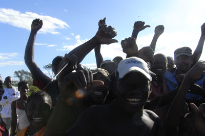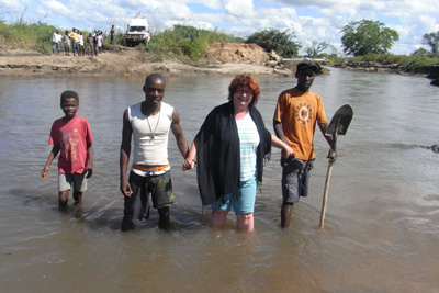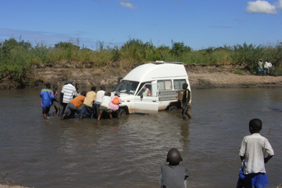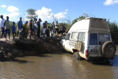 Freitag, 13. Mai 11, Tag 27, Albtraum## Wir wollen nicht wieder bis auf die Nationalstraße landeinwärts, sondern näher an der Küste auf einer Piste nach Norden. Es geht zwischen Feldern und durch Dörfer, der Weg ist anfangs recht schlecht, wird dann aber ein wenig besser, viele Brücken sind zu passieren. Doch dann, schon im letzten Fünftel der Strecke bis Quissange, von wo wir dann auf die Nationalstraße fahren wollten, fehlt eine Brücke. Sie wurde offensichtlich weggespült. Der Fluss ist zirka 20 Meter breit, hat deutliche Strömung, ist aber nicht sehr tief, wir sehen Fußgänger durch den Fluss waten und Radfahrer ihre Drahtesel hinüber tragen. Ich frage nach einer Umleitung. Könnte ja sein, dass schon eine Behelfsbrücke gebaut oder eine Furt angelegt wurde. Nein, gibt es nicht, mit dem Auto kommt man nicht rüber. Das heißt: Fast 100 Kilometer auf Holperpiste zurück und die gleiche Strecke auf der Nationalstraße wieder rauf, also 200 Kilometer Umweg, der zumindest fünf Stunden beansprucht. Ich sehe mir die Lage genauer an: Flussaufwärts ist das Ufer beidseits sehr steil, fast senkrecht und gut einen Meter hoch bis zur Wasseroberfläche. Unmöglich. Flussabwärts, dort wo die Fußgänger queren, könnte man vielleicht in den Fluss fahren, aber es ist nur ein Fußweg ausgetreten, beidseits davon steht Schilf und ist der Boden schlammig. Ich gehe durch den Fluss, der ist halbwegs gleichmäßig knapp knietief und der Untergrund sandig und fest. Drüben aus dem Fluss zu kommen, würde schwierig werden und falls es gelänge, müsste man dann ganz scharf die Richtung um 90 Grad ändern und auf einem ähnlichen Steig wie drüben auf die Straße fahren, wobei da nochmals zwei heftige Stufen zu bewältigen wären. Es könnte klappen. Ich sehe mich nach Bäumen um, an denen man sich im Falle des Falles mit der Seilwinde rausziehen könnte. In der Nähe gibt es nur Büsche; Bäume sind in in der Entfernung einer Seillänge nicht vorhanden. Aber es sind genügend Leute anwesend, die gegebenenfalls anschieben könnten, denn es haben sich schon gut 20, wenn nicht 30 Männer versammelt, die mit Interesse auf unsere Entscheidung warten. Wir wollen es versuchen. Ich übersiedle heikle Fracht, wie Notebook und andere elektronische Geräte in den ersten Stock und helfe Susi zu Fuß ans andere Ufer. Dann geht's los. Obwohl ich die linken Räder ganz knapp an der Uferkante halte, drückt es die rechten schon ordentlich in den Schlamm, dennoch komme ich problemlos bis an's diesseitige Ufer. Bevor ich in den Fluss fahre, muss ich am anderen Ufer die Böschung abgraben. Ich hole die Schaufel aus dem Keller, die mir ein Tatkräftiger aus der Hand nimmt und zusammen mit einigen anderen, die mit den Händen arbeiten, die Böschung bearbeitet. Ich fahre in den Fluss und komme auch problemlos bis zur Mitte, doch dann gräbt sich unser Buschtaxi plötzlich ein. Offenbar war der Grund doch nicht so fest, wie ich beim Durchwaten den Eindruck hatte, oder bin ich zu langsam gefahren? Jedenfalls komme ich trotz schiebender Menge weder vor noch zurück. Das Wasser steht bis zur Vordertürunterkante, schwappt gerade nicht herein. Ist also gar kein Grund zur Panik. Schauen wir mal, wie weit das Seil der Winde reicht. Das erste Bäumchen, das eigentlich eher ein Strauch ist, entwurzle ich problemlos. Mittlerweile steigt der Wasserpegel und ich habe Wasser im Fußraum. Dann zeigen mir meine Helfer ein Bäumchen, das doch ganz ansehnlich gebaut ist, das aber deutlich weiter weg ist. Bergegurt und Baumschutzgurt müssen raus. Leider noch immer zu kurz. Nach einer Verlängerung mit dem Abschleppseil geht sich's grade aus. Das ist vielleicht Zentimeterarbeit! Dieses Bäumchen hält und ich ziehe mich bis ans Ufer. Nun bin ich aber nicht an der Stelle gelandet, wo wir die Böschung abgegraben haben, sondern wo es sehr steil ist. Das Bäumchen steht nun leider in der falschen Richtung, um mich an ihm die Böschung hinaufzuziehen. Wir suchen nach einem neuen Haltepunkt, für den eigentlich nur ein Strauch in Frage kommt. Ob der halten wird? Wir versuchen es, doch es schneidet sich das Seil in die Böschung ein, das Auto bewegt sich nicht. Ich lasse Baumstämme bringen, die wir dem Seil unterlegen, und jetzt hebt sich die Schnauze unseres Buschtaxis. Stück für Stück kommt es nun aus dem Wasser und steht am Ufer, allerdings mit den Vorderrädern schon wieder im Matsch. Plötzlich funktioniert auch die Steuerung unserer Seilwinde nicht mehr. Anscheinend ist hier Pause. Wir stellen uns auf zwei oder drei Tage Warten ein, dann ist es hier trocken und wir fahren problemlos rauf auf die Straße. Ich teile unseren Helfern den Entschluss mit, weiß aber nicht, ob sie das verstanden haben. Als ich Werkzeug, Gurte und Seil einpacke, nehmen mich die Anführer der Truppe beiseite und präsentieren ihre Forderung für die Hilfe: 3.000 Metical für alle. Das sind knapp 70 Euro. Da es sein könnte, dass wir in zwei oder drei Tagen nochmals Hilfe brauchen, versuche ich nicht, den Preis zu drücken, sondern verspreche, dass es die 3.000 gibt, aber erst wenn wir wieder auf der Straße stehen. Plötzlich entsteht eine Unruhe in den Helfern, jeder hat einen Plan, Rufe und Kommandos gehen durcheinander. Jedenfalls wollen alle sofort weitermachen. Die einen fangen mit Schaufel und Händen an, die Räder auszugraben, andere reißen tonnenweise Äste von den Büschen und legen sie vor die Räder, wieder andere graben die nächste Böschung ab. Und es klappt: Kurze Zeit später stehe ich auf der Straße. Es gibt ein Freudengeschrei, wie man bei uns noch keines gehört hat. Leider haben wir nur mehr knapp 1.500 Metical, weil wir in der Früh in Pemba vollgetankt haben. Ich gebe noch einen 50-Dollar-Schein dazu und erkläre den Helfern, dass das nun 3.000 Metical sind. Wider Erwarten glaubt man mir das und alle bedanken sich überschwänglich und wünschen uns gute Fahrt. Alles in allem hat die Bergeaktion 4 Stunden gedauert. Susi war ü