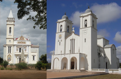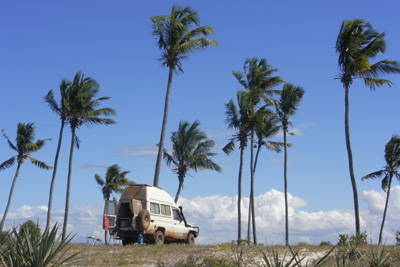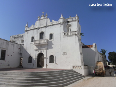 Dienstag, 10. Mai 11, Tag 24, Ilha de Mocamibque In Nampula kaufen wir ein paar Lebensmittel ein und fahren dann zügig Richtung Küste. Wir passieren einige schöne Kirchen, besonders auffällig ist allerdings die der Katholische Mission Sanctuario de Santa Maria Mae do Redentor. Und dann sind wir endlich am Meer. Der Indische Ozean besticht mit herrlich blauem Wasser, Palmen und weißem Sandstrand. Über eine dreieinhalb Kilometer lange schmale Brücke (Maut hin und zurück 10 Mt = 0,23 EUR) fahren wir auf die Ilha de Mocambique, deren Sehenswürdigkeiten wir ursprünglich zu Fuß erkunden wollten. Leider kann Susi heute praktisch nicht gehen, jeder Schritt verursacht ihr heftige Rheumaschmerzen. Und so sind wir froh, dass es fast keinen Verkehr gibt und die Gassen der Insel breit genug sind, so dass wir alles per Auto abfahren können. Während im südlichen Teil der Insel die vorwiegend aus Lehm gebauten Häuser stark dem Verfall preisgegeben sind, wurden im Norden die aus Stein gebauten kolonialen Bauten teilweise renoviert. Im Escondidinho essen wir ein Häppchen und genießen das ruhige und stimmungsvolle Ambiente. Über die Brücke geht es zurück auf's Festland und auf die Halbinsel Mossuril, wo wir am Ende der Landzunge direkt am weißen palmenbestandenen Sandstrand campieren. Ganz alleine. Es bleibt nur Zeit für ein schnelles Bad, dann geht idyllisch die Sonne unter. Als Nachspeise zur Abendjause essen wir unsere Ananas auf, die wir vor ein paar Tagen gekauft haben und die so groß war, dass wir tagelang davon essen konnten. Es ist ziemlich windig. An der nahen Lodge haben wir 150 Mt = 3,40 EUR an Gemeindeabgabe bezahlt, jedoch keinen Beleg erhalten. Km 276/5.661/49.203. |