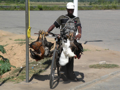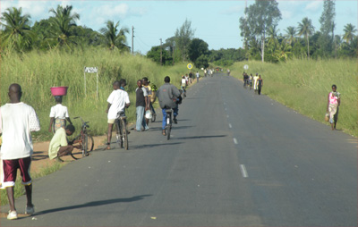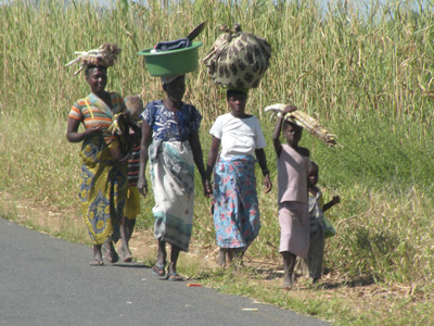 Auf mosambikanischer Seite dauert's ein wenig länger, gut eine Stunde. Weil die Beamten nicht Englisch sprechen (wollen), müssen wir uns eines Helfers bedienen, der kein Honorar verlangt, sofern man bei ihm Geld wechselt. Auf der einen Seite geht alles furchtbar altmodisch zu, etwa wird unsere Einreise in mehreren Büchern händisch protokolliert, andererseits kriegen wir ein ultramodernes Visum mit Webcam-Foto und codiertem Fingerabdrücken in den Pass geklebt. Das hat natürlich seinen Preis. Nämlich 72 USD = 50 EUR. Das Carnet wird vom Zoll anerkannt, nur falsch gestempelt. Tut ihm leid, hat er grad zum ersten Mal gemacht, sagt er. Auf Englisch übrigens. Die obligate Versicherung kostet 530 Mt = 12 EUR. Weitere Kosten wie Road-Tax oder Carbon-Tax fallen nicht an. Da mir der Wechselkurs unseres Helfers nicht schlecht vorkommt, tausche ich unsere verbliebenen 3.000 südafrikanischen Rand in 12.000 Mt. Dann können wir endlich die Grenzstation verlassen. Langsam fahren heißt die Devise, denn es sind sehr viele Menschen auf der Straße. Die meisten zu Fuß, es sind viele Kinder dabei. Alle tragen was auf dem Kopf: Säcke, Körbe mit Bananen oder Orangen, Töpfe mit Geschirr zum oder vom Abwasch, Körbe mit Wäsche, Werkzeug, leere oder volle Wasserkanister ... Viele Frauen oder größere Kinder haben Säuglinge umgeschnallt, auffälliger Weise meist nicht auf dem Rücken, sondern vorne. Manche sind mit Fahrrädern unterwegs und transportieren dabei Säcke mit Holzkohle, Obst, Heu, Holz ... Die Straße ist praktisch lückenlos gesäumt von Verkaufsständen, an denen alle erdenklichen Waren verkauft werden: Obst, Gemüse, Kleidung, Aufladebons für Handys, Schuhe, Möbel, die gleich nebenan hergestellt werden, ... Da es in Zentralmosambik nur 11 Einwohner pro Quadratkilometer gibt, meint unser Reiseführer, Auflage 2010 diesmal, muss es eigentlich abseits der Straße menschenleer sein. Ist es aber nicht, im Gegenteil. Nachdem wir von der ostwärts führenden Straße nach Beira nordwärts abgebogen sind, suchen wir in der Nähe des Mont Gorongosa einen Nachtplatz, doch jeder Weg, der von der Hauptstraße abzweigt, ist bevölkert und landet sofort in einem Dorf. Schließlich finden wir eine Wiese, die uns zum Übernachten geeignet erscheint. Es ist der Sportplatz des Dorfes. Ein paar Jugendliche kommen und ich frage sie, ob wir da bleiben können. Sie glauben schon, aber wir müssen den Chief informieren. Also ab zum Häuptling. Er wohnt gleich in der Nähe, ist ein würdevoll aussehender älterer Herr, der uns die Nächtigung wohlwollend gestattet. Km 308/4.110/47.552. |
