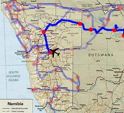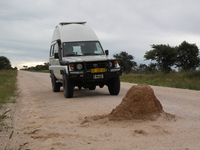 Dienstag, 19. April 11, Tag 3, Otjiwarongo Den Vormittag verbringen wir im Offroad-Center in Windhoek, wo der mitgebrachte neue Schnorchel eingebaut wird. Keine ganz einfache Sache, weil der mitgelieferte Luftschlauch nicht passt. Doch nach ein wenig Improvisation können wir zu Mittag Windhoek mit dem montierten Teil verlassen. Ein Stück außerhalb essen wir in einer etwas heruntergekommenen Lodge zu Mittag. Im Garten stehen Sitzgarnituren, bei der je zwei Bänke und ein Tisch zu einem Teil verbunden sind. Als ich mich niedersetze, kippt das Möbel und mein schon am Tisch stehendes Bier ergießt sich über Hemd und Hose. Noch bevor unsere bestellten Steaks erscheinen, fühle ich mich plötzlich unwohl, habe Kopfweh und Schweißausbrüche. Was wir dann auf unseren Tellern vorfinden, ist eher Leder als Fleisch, die Pommes sind nicht durch und dem Salat trauen wir ohnehin nicht. Während Susi doch etwas isst, rühre ich mein "Essen" nicht an, denn ich fühle mich auch ohne es elend. Wir fahren weiter nach Norden, doch nach kurzer Zeit kann ich nicht mehr. Ich fühle mich erschöpft und todmüde. Wir machen eine Pause und legen uns aufs Ohr. Danach fühle ich mich sehr viel besser und esse sogar eine von Sabines Wurstsemmeln. Auf der Weiterfahrt regnet es zeitweise wieder aus schwarzen Wolken. Am Abend erreichen wir Otjiwarongo, wo ich mich für ein Steak und ein nachfolgendes Eis mit Karamellsauce wieder gesund genug fühle. Wir übernachten auf dem Acacia-Camp mitten im Ort (S20 27.935 E16 39.247, 65 NAD = 7 EUR p.P.), an eine Übernachtung im Busch ist ohnehin nicht zu denken wegen der allgegenwärtigen Zäune. Km 275/345/43.787. Mittwoch, 20. April 11, Tag 4, Grootfontein Früh ins Bett und früh auf lautet die Devise, wenn die Sonne um 5.50 auf- und um 17. 20 untergeht. Nach dem Frühstück bastle ich ein Verlängerungskabel für unser neues GPS-Gerät, dessen Kabel zu kurz ist, um die Steckdose zu erreichen. Dann wechsle ich noch die kaputte Jalousie der Dachluke aus, womit wir auch die sperrige Verpackung der Ersatzjalousie los sind. Auf eintöniger Asphaltstraße geht es nach Otavi. Erst dann bieten Mais- und Sonnenblumenfelder ein wenig Abwechslung zum Buschland. In Grootfontein finden wir nach langem Suchen ein Internetcafe (S19 33.804 E18 06.227), essen in einem kleinen holländischen Lokal zu Mittag und tanken (wer weiß, ob wir auf den 350 Kilometern bis zur Grenze noch Sprit kriegen?). Ca. 40 Kilometer nach Grootfontein verlassen wir die Asphaltstraße und biegen nach Osten auf die Piste nach Tsumkwe ab, bis wohin fast durchwegs gut 100 km/h möglich sind. Es geht durch ödes Buschland und nur sehr wenige Fahrzeuge kommen uns entgegen. Nach 21 Kilometern soll eine Veterinärkontrolle kommen, weshalb Susi sicherheitshalber unseren Tiroler Speck aus dem Kühlschrank räumt. Üblicherweise werden nur Fahrzeuge kontrolliert, die aus Wildgebieten in Weidegebiete fahren, aber man kann nie wissen. Die Kontrollstelle ist unbesetzt und nach weiteren gut 10 Kilometern räumt Susi den Speck wieder in den Kühlschrank. Unglaublich, aber nach einem weitern Kilometer kommt die Kontrolle. Wir verwickeln den Beamten in ein nettes Gespräch und er interessiert sich mehr für die Kälte in Österreich als für unseren Kühlschrank. Von hier an gibt es keine Zäune mehr und das Buschland ist völlig verändert: War bisher das Gelände von dicht stehenden, etwa gleich hochen Büschen bedeckt, zwischen denen fallweise Kühe weideten, gibt es von nun an weit auseinander stehende Bäume und dazwischen sehr niedrige Büsche. Wir befinden uns hier im Reservat der San, die periodisch den Busch abbrennen. Immer wieder sehen wir Termitenhügel auf der Straße, oft ganz kleine, dann und wann aber auch so große, dass sie ein Hindernis für Fahrzeuge darstellen. In Tsumkwe gibt es in der Tat keinen Treibstoff (der Tankwagen kommt nächste Woche) und wir sind froh, dass wir in Grootfontein vollgetankt haben. Die letzten 40 Kilometer bis zur Grenze ist die Piste schmal und nicht mehr so gut. Heute war es ganzen Tag bedeckt, wir haben kaum einmal die Sonne gesehen, doch geregnet hat es auch nicht. Außer Kühen auf der Weide haben wir heute nur ein paar Perlhühner und einige Hyänen gesehen. Wir übernachten ca. 15 Kilometer vor der Grenze zu Botswana direkt neben der Piste; der Busch ist beidseits der Piste dicht und der Boden feucht. Wir rechnen nicht damit, dass uns hier jemand stört, denn der Grenzübergang ist von 17 bis 7.30 geschlossen und woanders kommt man auf der Piste nicht hin. Km 534/879/44.321. Donnerstag, 21. April 11, Tag 5, Drotsky-Cave Die zum Grenzübergang führende Straße hat die Dimension eines Feldweges, auch die Grenzstelle (S19 34.703 E20 59.770) ist recht einfach: Es gibt keinen Strom, geschweige denn einen Computer. Man protokolliert unsere Ausreise in einem Buch, stempelt die Pässe und macht, eher aus Neugierde als zur Eindämmung von Seuchen - wir reisen schließlich aus, einen Blick in den Kühlschrank. Die Road-Tax wird nicht kontrolliert. Nach 20 Minuten geht's hinüber ... |