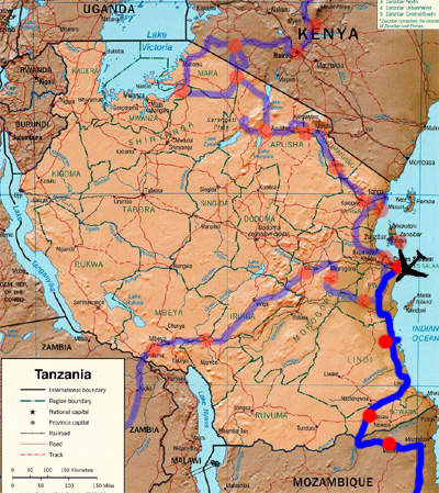 Mittwoch, 18. Mai 11, Tag 32, Kipepeo Beach Resort Susi fühlt sich schon seit vorgestern nicht so recht wohl, hat nun auch starken Durchfall und erbricht. Wir gehen kurz ins Meer um uns abzukühlen, denn bereits eine Stunde nach Sonnenaufgang ist es unerträglich heiß und schwül, doch die Abkühlung hält nicht lange an. Wir machen uns auf, ein besseres Camp zu suchen. Das ist bald gefunden: Wir machen es uns im Kipepeo Beach Resort gemütlich (5 USD = 3,50 EUR p.P. p.N). Hier gibt es auch ein ansprechendes Restaurant und Internet, das aber zeitweise nicht funktioniert. Mehrmals täglich fängt es ganz plötzlich zu Schütten an und nach einiger Zeit hört's genauso plötzlich wieder auf. Susi ist nun richtig krank, hat keinen Appetit, will auch nichts trinken und ist sehr schwach. Gut, dass wir hier drei Tage bleiben können. Km 6/7.432/50.974. Donnerstag, 19. Mai 11, Tag 33, Kipepeo Beach Resort Die Hitze und die Moskitos heute Nacht waren unerträglich. Susi geht es nicht besser. Wir mieten eine Hütte (25 USD = 17,50 EUR p.2P.p.N) , damit Susi auch am Tag liegen kann, denn im Auto ist es zu heiß. Da Susi ganzen Tag fast nichts getrunken hat, kriegt sie eine Nadel in den Arm und eine Infusion dran. Km 0/7.432/50.974. Freitag, 20. Mai 11, Tag 34, Kipepeo Beach Resort Mit ein wenig Phantasie könnte man meinen, Susi geht's etwas besser. Ich bringe ihr eine Tasse Kaffee mit viel Zucker, den trinkt sie. Am Vormittag muss ich sie alleine lassen, weil ich das total verdreckte Auto waschen lassen muss. Bis ich zurück bin, sind vier Stunden vergangen. Wer noch nie in Afrika ein Auto waschen ließ, weiß nicht, dass das einfach ein wenig länger dauert als bei uns. Als ich zurückkomme, hat Susi fast einen Liter Wasser getrunken. Ich bin begeistert, nehme sie zum Mittagessen mit und spendiere ihr eine Portion Reis. Davon isst sie zwei Bissen. Naja, ein Anfang ist es. Km 34/7.466/51.008. Samstag, 21. Mai 11, Tag 35, Dar es Salaam Susi geht es zwar besser, aber sie ist noch sehr wackelig auf den Beinen und nach kleinster Anstrengung außer Atem. Wir fahren zunächst zum Flughafen und nehmen, um abzukürzen, die Kivukoni-Fähre, die South Beach mit dem Stadtzentrum von Dar es Salaam verbindet. Leider müssen wir eineinhalb Stunden warten, bis wir endlich drankommen. Die Fähre kostet für Auto und Fahrer 1.000 TSH (0,50 EUR), für jeden zusätzlichen Insassen 100 TSH (0,05 EUR). Wir fahren durch ein kleines sehr sauberes und ordentliches Stadtzentrum mit etlichen historischen Bauten, außerhalb dieses kleinen Bereichs ist aber alles wieder schmutzig, unordentlich und chaotisch. Obwohl Samstag ist, ist der Verkehr ein Wahnsinn. Am Flugplatz lassen wir die Kartons mit unseren Souvenirs für den Flug folieren, damit auch alles heil zu Hause ankommt. Dann machen wir uns auf den Weg zu unserem Autoeinstellplatz, was wieder eineinhalb Stunden Stop-and-go-Verkehr bedeutet. Am Nachmittag räumen wir unser Auto aus und unterziehen es auf Grund der fortgeschrittenen Zeit und Susis Schwäche ausnahmsweise einer etwas abgekürzten Innenreinigung. Km 52/7.518/51.060. Mit dem Taxi geht es zum Flughafen, von wo wir via Nairobi ... Sonntag, 22. Mai 11, Tag 36, München ... und Zürich nach München fliegen, wo schon Sabine auf uns wartet. |