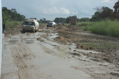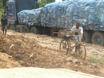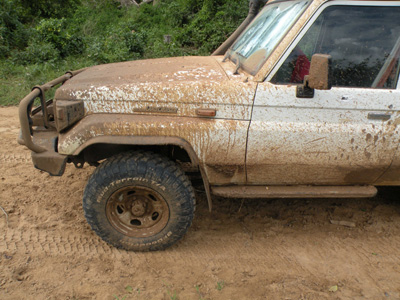Dienstag, 17. Mai 11, Tag 31, Schlammschlacht Wir bedanken uns für die Gastfreundschaft mit einem großen Brot. Unsere Gastgeber freuen sich sehr und wollen Telefonnummern austauschen. Ein Handy hat schließlich auch hier jeder. Wir machen einen Abstecher nach Kilva Kivinje, einer kleinen Hafenstadt, in der es noch etliche Bauten aus deutscher Kolonialzeit zu sehen gibt, natürlich alles verkommen und zum Teil verfallen. Als es zu schütten beginnt, beenden wir unsere Besichtigungsrundfahrt und setzen unseren Weg nach Norden fort. Nach kurzer Fahrt hat jedoch die Asphaltstraße ein jähes Ende. Wir hatten nicht damit gerechnet, dass die Haupt-Nord-Süd-Verbindung des Landes noch nicht durchgehend asphaltiert wäre. Im Nu ist die Sandpiste eine Schlammpiste, schließlich ist ja hier noch immer Regenzeit und es hat in den vergangenen Wochen zumindest einmal täglich Niederschlag gegeben. Die Pfützen, die wir durchfahren müssen, werden immer länger, nur mit viel Schwung geht es durch und wir hoffen halt, dass sich darin keine übermäßig tiefen Löcher befinden. Eine Weile fahren wir schon hinter einem Autobus und einem LKW her, als plötzlich stop ist. Eine lange Kolonne von Fahrzeugen, vorwiegend Lastern, steht vor uns. Es wird uns rasch klar, dass hier ein Problem vorliegt, das nicht in ein paar Minuten behoben ist. Wird es in einer halben Stunde weitergehen? In ein paar Stunden? Oder stehen wir hier vielleicht einige Tage? Aussteigen und nach vorne gehen um zu sehen, was los ist, kommt überhaupt nicht in Frage, denn an manchen Stellen versinkt man bis zum halben Unterschenkel im Schlamm. Warum wir das wissen? Weil aus dem Bus vor uns dann und wann Leute aussteigen, die auf's Klo müssen. Bald schon kommen Einheimische, die in riesigen Körben oder Kühlboxen auf dem Fahrradgepäckträger Getränke, Kekse, Obst, ja sogar Fische bringen und zum Kauf anbieten. Nach etwa einer Stunde oder so geht es ein paar Meter vorwärts. Irgendwann taucht ein Grader auf, der eine neue befahrbare Fläche anlegt. Auf die fährt dann nach vielleicht einer weiteren Stunde der Gegenverkehr. Irgendwannn geht's dann bei uns wieder ein paar Meter weiter und noch ein paar und wieder. Nach in Summe vielleicht drei bis vier Stunden Herumsteherei, die wir mit Lesen und Maiskolben Futtern verbringen, geht es weiter. Einige sehr schwere Fahrzeuge wurden von einem Bagger sozusagen aus dem Verkehr gezogen. Weitere Laster fahren an passenden Stellen zur Seite und lassen uns vor. Dann sind wir wieder ungehindert unterwegs. Doch der Gatsch wird eher mehr als weniger. Dann fällt auch noch etwas Regen. Es kann sich keiner vorstellen, wie der Dreck hochspritzt und wie unser Auto bald aussieht. Wir können es selbst fast nicht glauben, als wir bei einer sehr verspäteten Mittagsrast an einer seltenen halbwegs trockenen Stelle aussteigen und unser Auto ansehen. Als wir dann nach weiteren Stunden endlich wieder Asphalt erreichen, sehen wir die ob des Drecks an unserem Auto fassungslosen Blicke entgegenkommender Autofahrer. Die wissen noch nicht, was auf sie zukommt. Wir überqueren den Rufiji auf einer modernen Brücke und im Ort Kibiti treffen wir nach 2 Jahren und 4 Monaten auf unsere Spur, auf der wir damals von Daressalam nach Sambia gefahren sind. Erst bei totaler Finsternis kommen wir am South Beach an, wo wir uns für die nächsten Tage einen guten Campingplatz suchen wollten. Heute sind wir froh, dass wir überhaupt einen finden (New Ngonda Camping Site, S6 49.661 E39 19.935). Der kostet nach Verhandlung 5.000 TSH = 2,5 EUR p.P. und hat außer Platz nichts zu bieten. Reichlich Müll liegt herum, die Toiletten sind rudimentär, laute Musik dröhnt von der Bar nebenan. Wieder ist die Nacht schwül und wir schwitzen unvorstellbar. Km 341/7.426/50.968. |