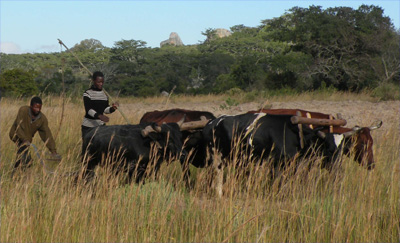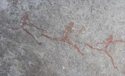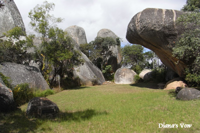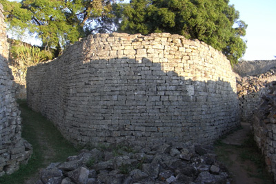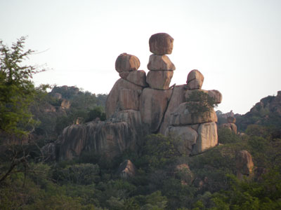 Donnerstag, 28. April 11, Tag 12, Great Zimbabwe Für die Übernachtung bezahlen wir 8 USD = 5,60 EUR p.P. World's View ist wohl der schönste Platz im Nationalpark. Es ist ein Felshügel, auf dem einige deutlich mehr als mannsgroße Felskugeln liegen und von dem man einen wunderschönen Blick auf die Felsformationen der Umgebung hat. Hier befindet sich auch das Grab von Cecil Rhodes. Wir sehen uns noch die White Rhino-Cave an, eine Höhle mit Felszeichnungen, die nur erreicht werden kann, wenn man einen Bach durchquert. Der Bach ist zwar momentan trocken, aber das gut zwei Meter hohe Gras im Bachbett ist noch nass. Das weiße Nashorn ist wenig beeindruckend, da gefällt uns die Gruppe laufender Menschen daneben schon mehr. Auf dem Weg zum Parkausgang liegt noch ein Kriegerdenkmal, der M.O.T.H.-Shrine. In Bulawayo suchen wir uns ein Internetcafe, wollen dann aber schnell wieder die Stadt verlassen, um noch vor dem Abend in Great Zimbabwe zu sein. Leider finden wir die richtige Stadtausfahrt nicht auf Anhieb und verfransen uns mächtig. Auf der Fahrt nach Masvingo gibt es eine Veterinärkontrolle, mindestens vier Polizeikontrollen und zwei Mautstationen (je 1 USD = 0,70 EUR). Etwas später als gewünscht erreichen wir Great Zimbabwe (Besichtigung 15 USD = 10,50 EUR p.P, Camping 5 USD = 3,50 EUR p.P) und es bleibt uns nur mehr eine Stunde bis zum Sonnenuntergang zur Besichtigung der Talruinen. Susi ist sehr beeindruckt, auch meine Begeisterung ist beim zweiten Besuch (siehe hier) ungebrochen. km 392/2.762/46.204.
