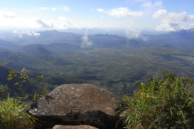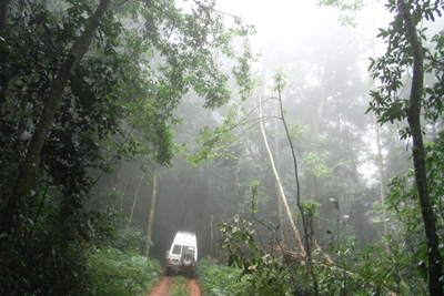 Samstag, 30. April 11, Tag 14, Chimanimani Mountains Der Bodennebel lichtet sich und gibt einen wolkenlosen Himmel frei. Auf einer ähnlichen Piste wie gestern fahren wir zum Big Tree, einem riesigen ein- bis zweitausend Jahre alten Mahaghonibaum. In der Nähe gäbe es noch das Valley of Gigangts zu bestaunen, in dem weitere Baumriesen stehen. Doch der Weg geht ziemlich bergab und der Boden ist lehmig und nass und daher für Susi nicht zu bewältigen. Auf der Rückfahrt nach Chipinga treffen wir zwei weiße Farmer, die auf Motorrädern unterwegs sind und die Maisernte überwachen. In einem kurzen Gespräch erzählen sie, dass nur mehr ganz wenige von ihnen im Land seien, es sei sehr schwierig, doch sie hätten keine Alternative zum Bleiben. Sie sind nun in vierter Generation hier und sie wüssten nicht, was sie tun sollten, außer das wenige ihnen verbleibende Land zu bestellen. In Chimanimani (1.450 m) essen wir im Hotel zu Mittag. Im riesigen Speisesaal stehen etwa 30 Tische, doch wir sind die einzigen Gäste. Den Kaffee nehmen wir im subtropischen Garten ein, wo gerade eine Hochzeitsgesellschaft zum Fotoshooting gekommen ist. Wir befinden uns hier in einer sehr abgelegenen Gegend, wo nicht oft Weiße hinkommen. Das zeigt sich unter anderem daran, dass einige Burschen von der Hochzeitsgesellschaft sich zu uns setzen, um sich mit uns fotografieren zu lassen. Auch auf der weiteren Fahrt drehen sich alle Fußgänger, die uns entgegenkommen, nach uns um. Vielleicht ist hier eine gute Gelegenheit, anzumerken, dass wir in Zimbabwe (mit Ausnahme einiger der vielen Polizisten) ausschließlich freundliche Menschen getroffen haben. Oft begegnete man uns mit offener Neugier, doch nie wurden wir angebettelt oder gar angepöbelt. Von Chimanimani nach Mutambara kann man entweder auf der Asphaltstraße fahren (60 Kilometer) oder auf der von unserem Reiseführer (the one and only, Huppe, in der letzten Auflage von 1999) favorisierten und 9 Kilometer längeren "Scenic Route" durch die Chimanimani Mountains. Keine Frage, dass wir durch die Berge fahren, noch dazu, wo der Abzweig mit "Scenic Route" beschildert ist. Die Piste ist recht hart und zudem durch LKW ausgefahren, die Holz aus den Wäldern transportieren. Nachdem die Urwälder hier ja schon vor langer Zeit abgeholzt wurden, wechseln Felder mit in Monokultur aufgeforsteten oder brachliegenden Flächen. Nach einem Dorf wir die Piste plötzlich schmäler, schlechter und es sind kaum mehr Reifenspuren zu finden. Wir vergewissern uns, dass wir noch richtig sind und fahren weiter. In unendlichen Kurven geht es die Berge, die die Grenze zu Mosambik bilden, hinauf, bald nur mehr im Schritttempo, dann ist auch Allrad, sogar mit Untersetzung nötig, da die Piste häufig ausgewaschene Stellen aufweist. Immer wieder tun sich überwältigende Panoramen auf, toll sehen auch die Wolken aus, die vom Indischen Ozean über die Chimanimani Mountains gedrückt werden. Bald ist klar, dass die Scenic Route wenigstens ein Tagesausflug wird, denn eine Durchschnittsgeschwindigkeit von 10 km/h lässt sich nicht erreichen! Am späten Nachmittag haben wir auf gut 1.800 Metern Seehöhe einen Pass überquert und erwarten jetzt die Abfahrt, doch die kommt nicht. Es geht zwischen 1.700 und 1.800 endlos kurvig weiter. Wir übernachten direkt auf der Piste, hier kommt garantiert kein anderes Auto vorbei. Es ist ziemlich kühl und wir entzünden ein Lagerfeuer. Km 145/3.214/46.656. |