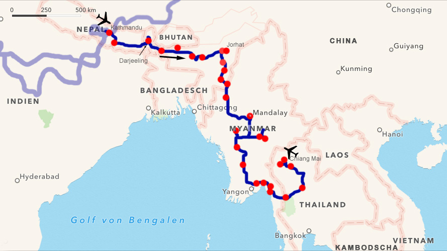 Am 11. Oktober brechen wir zur sechsten Etappe unserer Weltreise auf. Sie führt uns von Kathmandu in Nepal durch das krisengeschüttelte Terai in die Nordostprovinzen Indiens, wo wir in Assam Opfer eines nächtlichen Überfalls vierer Männer werden. Glücklicherweise geht die Sache halbwegs glimpflich aus. Wir durchqueren Myanmar, das ehemalige Burma (Birma), das man erst seit zwei Jahren mit eigenem, ausländischem Auto bereisen darf, und das auch nur auf höchst bürokratische Weise und mit mehreren Begleitern. Aus Kostengründen bilden wir einen Konvoi mit Annette und Stefan aus Deutschland, unterwegs mit einem Mercedes G auf der Seidenstraße nach Singapur (www.mybeastgoeseast.wordpress.com) und mit Claire und Emiel aus Australien, die auf der Heimfahrt von einem Verwandtschaftsbesuch in Holland mit einem Landcruiser sind. Dann geht es in den Norden Thailands zu historischen Stätten und urwaldbewachsenen Bergen. Auf Grund eines gesundheitlichen Problems müssen wir in Chiang Mai unsere Etappe vorzeitig abbrechen und können nicht wie geplant bis Luang Prabang in Laos weiterfahren. Mein Dank gilt Mutu Suresh von Myanmar Expert Travel & Tours in Yangon, unseren "Vorfahren" Ruth und Walter Odermatt aus der Schweiz (www.reisevirus.info), wiederum dem Österreichischen Honorarkonsul in Kathmandu Rajesh B. Shrestha, seinem Kollegen Nikolaus Prachensky in Chiang Mai, ganz besonders dem ÖAMTC, weiters Resi, Michaela, Sabine und Eva. Danke auch wieder allen, die uns schreiben. Unserer besonderer Dank richtet sich an die Familie von Sakina Yasmin und Tosiman Hauge Neog, die uns nach dem Überfall beigestanden sind, an die Polizei in Jorhat, Assam und an alle, die völlig kostenlos an der Reparatur unserer demolierten Windschutzscheibe mitgearbeitet haben, allen voran Prabhdeep Singh. Allen, die mit eigenem Auto Myanmar bereisen möchten, sei die Agentur "Burma Senses" auf Grund übler Organisationsmängel und der Unfähigkeit, Versprochenes einzuhalten und Gebuchtes durchzuführen, ausdrücklich NICHT empfohlen.