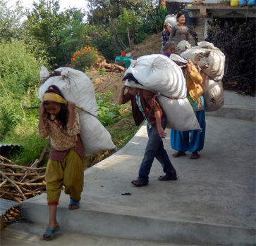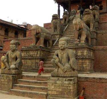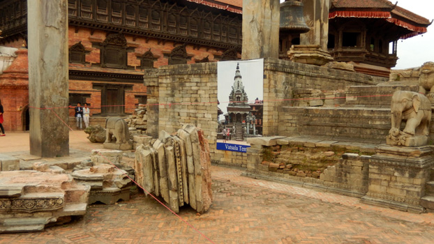 ... nach Kathmandu, wo wir nach einer wegen der Zeitverschiebung recht kurzen Nacht bei angenehmen 17 Grad landen. Ein Taxi bringt uns zum Zerberus, der die acht Monate Stillstand und die beiden schweren Erdbeben unbeschadet überstanden hat. Kaum zu glauben, er springt beim ersten Startversuch an! Bereits am Vormittag ist es so schwül, dass wir beim Auspacken wie die Irren schwitzen. Leider ist in einer Reisetasche eine Dose mit Instant-Kaffee geplatzt, die wir schonend zwischen verschiedene Kleidungsstücke platziert haben. Da dem Kaffee Milchpulver und Zucker beigemischt sind, sind mehrere Kleidungsstücke und die Tasche total versaut. Als wir wegfahren wollen, imitiert der Zerberus das Motorengeräusch eines Traktors und will sich nicht bewegen. Wir sind ernsthaft beunruhigt, doch beim nächsten Versuch fährt er mit normalem Motorgeräusch weg und folgt von da an aufs Wort. Das lohnen wir ihm mit einer Wäsche. Nach einem Großeinkauf sehen wir uns noch das buddhistische Kloster Kopan im Nordosten Kathmandus an. Auf den ersten Blick sind in der Stadt kaum mehr Erdbebenschäden zu sehen. Aber wir fahren ja nicht durch's Zentrum, wo die ältesten Gebäude stehen oder standen und wo die größten Schäden aufgetreten sind. Der Schutt ist natürlich längst weggeräumt; an vielen Orten sind noch brauchbare Ziegel aufgestapelt. Wir verlassen die Stadt nach Osten, machen einen Abstecher zum wenig beeindruckenden Hindu-Tempel Suriya Binayak und spazieren dann durch das Zentrum von Bhaktapur. Am Durbar-Square sind viele Tempel zerstört. Der Schutt ist weggeräumt, viele Gebäude wurden mit Balken gestützt und große Plakate zeigen die Ansicht der jeweiligen Tempel vor den Beben. Viele Menschen leben in Notunterkünften wie Blechhütten und Zelten. Wir übernachten auf einem vom Vorjahr uns bekannten Platz vor einem kleinen Tempel vor Panauti. Km 57/57/38.671.