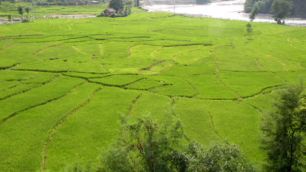 Als wir um zehn munter werden, sind wir schweißgebadet, Matratze und Polster sind total nass. Es hat 33 Grad und kein Lüfterl regt sich. Wir sind durstig, doch jedes Getränk fließt durch die Schweißporen sofort wieder nach draußen. Eine Dusche bringt für zwei Minuten Abkühlung, aber man kann sich nicht trockenfrottieren, wir sind sofort wieder nass. Nach einem schnellen Frühstück fahren wir weiter, erst die Klimaanlage macht die Schwüle erträglich. Das Terai ist eine fruchtbare Tiefebene, auf der Reis- und andere Felder dominieren. Die hier typischen Häuser sind zweistöckig und von Palmen umgeben. Erstaunlich schnell sind wir an der Grenze. Am nepalesischen Zoll fahren wir einfach vorbei, denn wir haben ja bei der Einreise im Februar unser Carnet nicht stempeln lassen. Im Immigration Office dauert es keine zehn Minuten und schon geht es nach Indien.