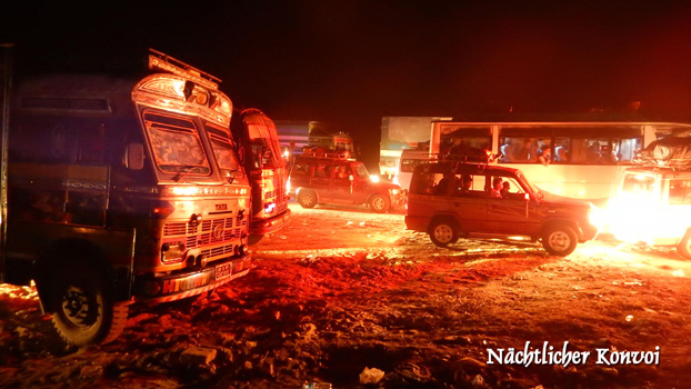 Als der Wecker klingelt, ist es eigenartig still draußen. Wir waren auf hektisches Treiben und laufende Motoren gefasst, denn viele haben seit dem Morgen gewartet! Es stehen aber noch alle Fahrzeuge da, der Konvoi ist nicht ohne uns abgefahren. Die Abfahrt verzögert sich immer wieder um zehn Minuten. Wir dürfen uns aber als eines der ersten Fahrzeuge vor die vielen LKW und Busse einreihen. Im Gegensatz zu Honorarkonsuln anderswo, die vielfach Mails einfach nicht beantworten, ist der österreichische Konsul in Kathmandu echt ein Freund. Auf meine gestrige Anfrage erhalten wir die Information, dass die Grenzen definitiv offen sind. Um kurz vor eins geht es dann los. Alle fahren wie die Wilden, wir werden ständig hupend überholt, der Konvoi ist eigentlich zweispurig, mit Gegenverkehr wird nicht gerechnet. Aber natürlich kommt irgendwann der Gegenkonvoi, der auch zweispurig unterwegs ist, und das wird auf einer zweispurigen Straße schnell mal eng. Im Nu kommen beide Konvois zum Stillstand und es dauert lange, bis sich die Fahrzeuge laut hupend mit Zentimeterabständen aneinander vorbeischieben. Irgendwann fahren wir dann wieder. In jedem Dorf steht eine Militärstreife und sieht uns beim Rasen zu, sonst sind kaum Menschen zu sehen; wir vermuten eine Ausgangssperre. Nach der Überquerung des Sapta Koshi ist das vollkommen anders, hier sind um vier Uhr nachts total viele Menschen zu Fuß, mit Fahrrädern oder Mopeds unterwegs, die einen in unserer Richtung, die anderen in der Gegenrichtung. Das Fahren erfordert daher höchste Konzentration. Fährt man langsamer als der Konvoi, wird man ständig überholt und rücksichtslos geschnitten. Also halten wir das Tempo, meist 60 bis 80. Vor Itahari löst sich der Konvoi auf, wir fahren noch 20 Kilometer aus der Stadt und suchen uns einen ruhigen Ausschlafplatz im Wald. Mittlerweile ist es fast sechs und es dämmert. Noch immer ist es total schwül. Km 195/430/39.044.