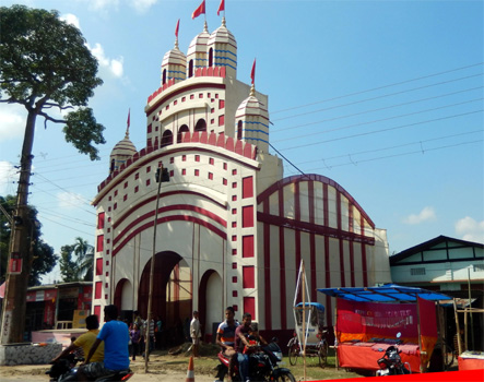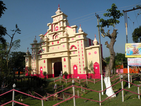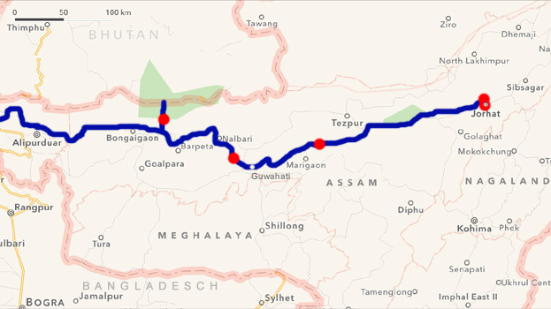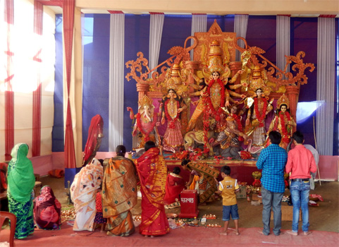 Erstaunlicher Weise bleibt es auf dem Truck Terminal die Nacht über ruhig, kein einziger LKW hat sich hierher verirrt. Zuerst auf Autobahn, später auf einfacheren Straßen verschiedenen Zustandes fahren wir weiter ostwärts. Die Festivals scheinen ihrem Höhepunkt näher zu kommen. Die Stofftempel, oftmals mehrere in einem Ort, sind fertig, im Inneren mit Altären, Blumen und bunten Figuren geschmückt und oft dröhnt laute Musik heraus. Rundherum sind Verkaufsstände für Souvenirs, Spielzeug und Essen aufgebaut. Wir passieren den am Südufer des Brahmaputra gelegenen Kaziranga-Nationalpark, der dafür berühmt ist, dass hier zwei Drittel der weltweit noch existierenden 2.700 Panzernashörner leben. Wir wissen, dass der Park erst im November öffnet, da viele Wege nach der Regenzeit noch überflutet sind. Doch auch von der vorbei führenden Fernstraße sind jenseits eines Flusses einige Nashörner, Büffel und eine große Elefantenherde zu beobachten. In Jorhat finden wir einen ruhigen Platz auf einem Damm nahe des Brahmaputra, wo wir den Nachmittag im Schatten des Zerberus vertrödeln und, weil der Platz so nett ist, auch gleich übernachten. Heute haben wir 40.000 Kilometer zurückgelegt, seit wir vor eineinhalb Jahren von zu Hause abgefahren sind. Km 245/1.572/40.184.