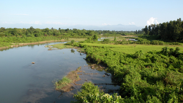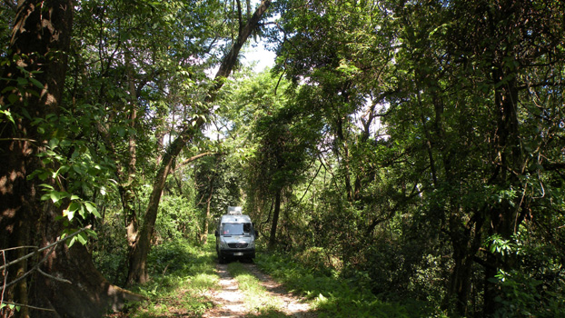 Zügig geht es auf der Autobahn in der Brahmaputra-Tiefebene weiter ostwärts. Nur sicherheitshalber, damit keine Missverständnisse aufkommen: Es ist eine indische Autobahn. Also mit unabgesicherten Baustellen, Gegenverkehr, Rad- und Motorradfahrern, Fußgängern, Kühen und Ziegen. Sie führt auch durch Dörfer, in denen Busse und Sammeltaxis halten und Querstraßen kreuzen, denen wir Vorrang geben sollten. Aber an Verkehrsschilder hält sich hier ohnehin niemand. Insgesamt ist der Verkehr aber eher mäßig und es lässt sich entspannt fahren. Die Route führt durch Reis- und gelegentlich Teefelder, niedrige Wälder mit reichlich Bananenstauden und Palmen. An der Straße stehen bunt blühende Büsche und Stauden. In Bongaigaon fahren wir ins Stadtzentrum, finden auf Anhieb einen Bankomaten, der uns Geld gibt (das ist nicht selbstverständlich) und finden auch sofort einen Reifenladen, der einen Reifen in fast der richtigen Größe hat. Unseren defekten Reifen verkaufe ich um 100 Rupien an einen der Reifenmonteure, der vor Freude strahlt, weil er so ein tolles Schnäppchen gemacht hat. Zu Mittag fahren wir dann zum Manas-Nationalpark an der Grenze zu Bhutan. Wir wollen noch vor dem Gate am Manas-River übernachten, doch die Parkranger bestehen darauf, dass wir bei Ihnen im Camp vor dem Park nächtigen. So fahren wir nur zum Relaxen an den Fluss, Susi erspäht auf der Fahrt dorthin schon ein Panzernashorn. Wir verbringen ein paar faule Stunden am Ufer im Schatten unseres Autos. So richtig gewöhnt haben wir uns an die Hitze noch nicht. Der Schweiß läuft und läuft und läuft. Kurz vor Sonnenuntergang übersiedeln wir ins Camp, wo gerade noch Zeit zum Duschen ist, dann kommen die Mücken und wir verziehen uns ins Auto. Wir können uns nicht vorstellen, wie die Leute hier bei dieser Mückenplage im Freien herumsitzen können. Km 206/1.039/39.651.