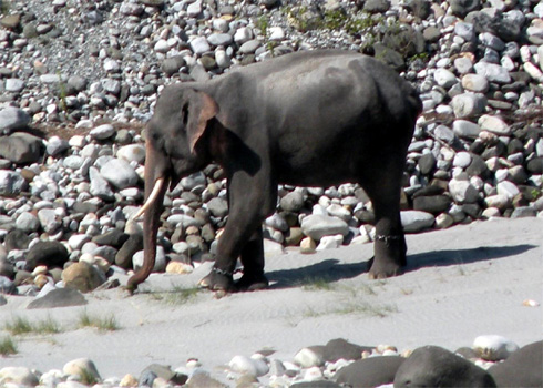 Der Chefranger, mit dem ich gestern gesprochen habe, hat uns erklärt, wir dürfen nur in Begleitung eines bewaffneten Rangers in den Park. Heute ist ein anderer Ranger im Dienst, der einfach fragt, ob wir eine Eskorte wollen oder nicht. Ich verneine, bezahle die Eintrittsgebühr (500 Rupien = 7 EUR p.P. plus 300 Rupien = 4,30 EUR für's Auto plus 500 Rupien für die Mitnahme einer Fotokamera, die ich mich weigere zu bezahlen, geht dann gerne auch ohne) und los geht unsere Safari. Bis ans nördliche Ende des Parks direkt an der Grenze zu Bhutan sind es zirka 16 Kilometer durch niedrigen Urwald, auf denen wir einen Marder und ein paar Vögel sehen. Schmetterlinge könnte man der Vollständigkeit halber noch aufführen. An der Grenze endet der Weg am Manas River, an dessen jenseitigem Ufer (drüben reicht der Park noch viel weiter) ein Elefant steht und äst. Endlich ein Wildtier! Doch ein Blick durch das Fernglas zeigt, dass wir uns täuschen: Der Elefant hat die Vorder- und Hinterbeine mit Ketten aneinander gebunden. Unglaublich, wie mit den Elefanten im Nationalpark umgegangen wird! Den Großteil des Rückwegs legen wir auf einem flussnahen Weg zurück, doch auch hier ist die Ausbeute unserer Safari gering: Wir sehen einen Leguan und einen Wiedehopf. Ein wenig enttäuscht verlassen wir am Nachmittag den Park und fahren noch ein Stück ostwärts. Wie schon an den letzten Tagen sehen wir, dass vielerorts Tempelattrappen aus Bambusgerüsten und Unmengen Stoff für ein Festival errichtet und bunt bemalte Götterfiguren dorthin transportiert werden. Kurz vor Hajo übernachten wir auf einem freien Platz in einem Straßendorf. Immer wieder, auch nachdem wir uns bei Einbruch der Dunkelheit ins Auto zurückgezogen haben, kommen junge Burschen und wollen wissen, wo wir herkommen, aha Australia, wo wir hinwollen, was das für ein Auto ist, so eines haben sie noch nicht gesehen. Km 137/1.175/39.788.