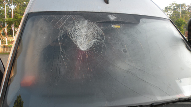 Es ist 21 Uhr 30, als jemand sehr kräftig ans Auto klopft. Mehrere Stimmen sind draußen zu hören. Ich sage "one moment please", ziehe eine Hose an und öffne die Tür. Draußen stehen vier junge Männer, die wild gestikulieren und offensichtlich ein wenig alkoholisiert oder auf Drogen sind. Ich sage "Namaste", aber das stimmt sie nicht freundlich. Ich frage, was sie wollen, doch sie verstehen mich nicht und auch ich verstehe ihre Sprache nicht. Sie machen einen gewaltbereiten Eindruck und mir ist nicht klar, was sie wollen. Sind sie nur neugierig und wollen sie das Innere des Autos sehen? Ich lasse einen reinsehen, doch das ist anscheinend nicht ihr Begehr. Sie werden immer wilder und letztlich drischt einer mit einem kopfgroßen Stein zweimal auf unsere Windschutzscheibe, die splitternd zerbricht, aber stehen bleibt. Dann vertrollen sich die Typen und wir verlassen fluchtartig den Platz. Bald erreichen wir eine Siedlungsstraße und ich halte an einem Haus, das sehr gepflegt aussieht und an dem noch Licht brennt. Wir dürfen sofort den Zerberus in den Garten fahren, werden ins Haus gebeten und erzählen im Kreis der Großfamilie unser Erlebnis. Man beschließt, die Polizei zu rufen. Bis diese eintrifft, müssen wir uns mit allen fotografieren lassen, weitere Familie kommt und will ebenso Fotos mit uns. Dann kommen endlich drei Mann Polizei, ich erzähle wieder, schließlich kommt noch der Chef der Polizisten und ich erzähle nochmals. Der Chef ordnet an, dass wir im Hof eines Amtsgebäudes übernachten müssen, wo wir absolut in Sicherheit seien. Morgen wird er sich um eine Reparatur bemühen. Wir folgen also dem Polizeiwagen ins Stadtzentrum und begeben uns dort erneut zur Ruhe. Nur kurz allerdings, denn eine halbe Stunde später klopft es erneut, die ersten Reporter stehen vor der Tür. Das ist ja unglaublich! Ich sage denen, dass wir jetzt schlafen wollen, sie sollen morgen wieder kommen. Km 9/1.581/40.193.