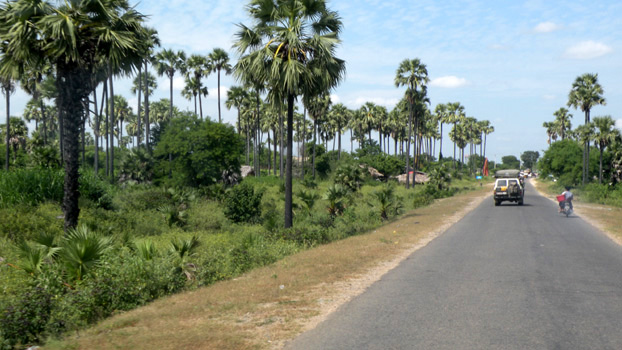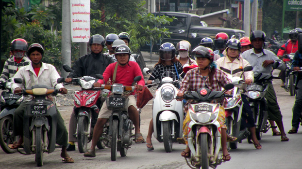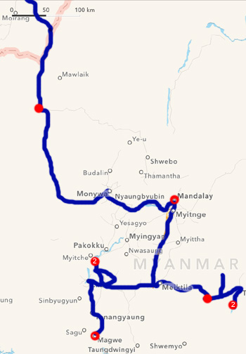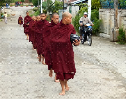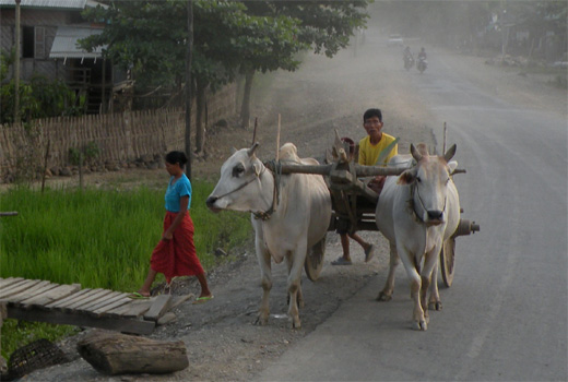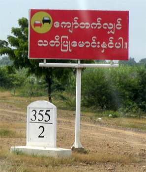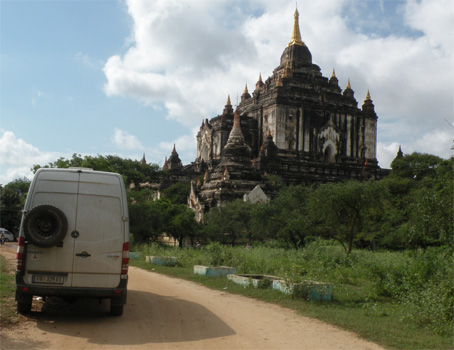 Auf indischer Seite dauert die Abfertigung anderthalb Stunden, alles komplikationslos und easy. Im Niemandsland treffen wir zwei Leute unserer Agentur, deren Fahrer und einen Regierungsbeauftragten. Es gibt eine kurze Diskussion, weil die Gruppe nun entgegen unserer V'ereinbarung aus zehn anstatt aus acht Mitgliedern besteht. Neben Annette und Stefan aus Deutschland mit einem Mercedes G, Claire und Emiel aus Australien mit einem Landcruiser und Karen und Vince aus Australien auf einem Motorrad sind nun auch noch V. und S., ebenfalls aus Australien mit zwei Motorrädern dabei. Unser erster Eindruck von Myanmar ist sehr positiv: Es ist sauberer und ordentlicher als in Indien, die Straßen sind besser. Wir fahren übrigens wieder rechts (in Nepal und Indien galt Linksverkehr), in Thailand dann wieder links und in Laos wieder rechts. Zu Mittag essen wir in einem Restaurant, endlich schmeckt auch das Essen wieder, nicht alles ist scharf. Ab Kalay sind dann die Straßen nicht mehr soo toll und vor allem recht schmal. Ein Auto plus ein entgegen kommendes Motorrad gehen sich gerade aus. Es geht vorbei an Reisfeldern, später durch Wälder, wir passieren buddhistische Tempel, Stupas, gelegentlich eine Kirche. Mehrmals sehen wir Schäden durch Hochwasser. Bei Einbruch der Dunkelheit werden überall Kerzen aufgestellt. Es ist das Vollmondfest, das an die Erleuchtung Buddhas erinnert. Wir übernachten vor einem Hotel in Gangaw. Beim gemeinsamen Abendessen gibt es Stunk, weil V. auf sehr unhöfliche Art kritisiert, dass wir am Abend eine Stunde bei Dunkelheit fahren mussten. Km Km 282/2.446/41.067.