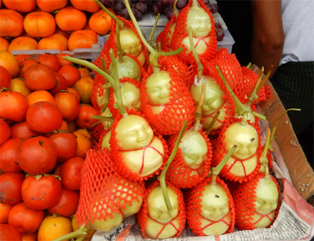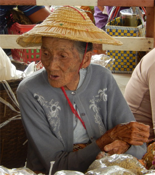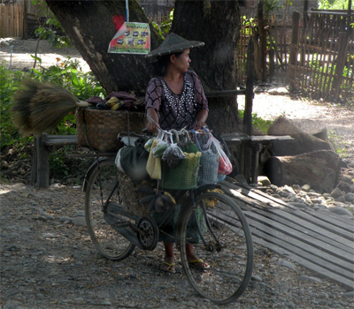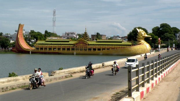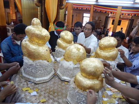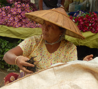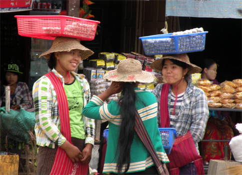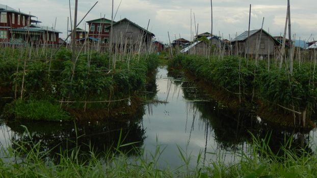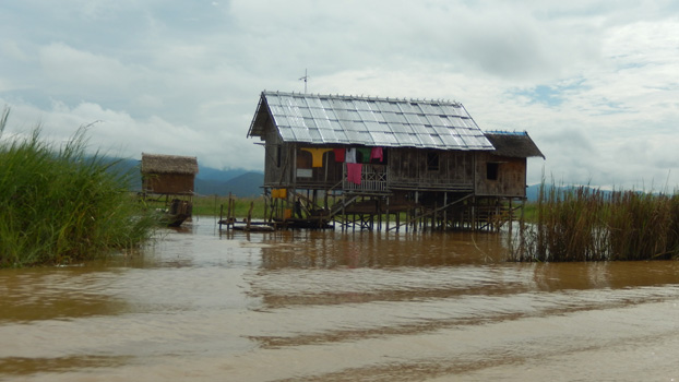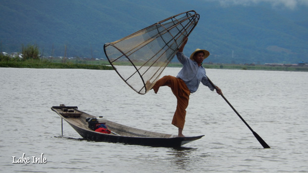 Der Inle-See erstreckt sich über etwa 30 Kilometer in Nord-Süd-Richtung, die Breite ist schwer anzugeben, weil an vielen Stellen nicht klar ist, wo sich das Ufer befindet. Wenn man mit dem Boot unterwegs ist, meint man oft, das Ufer erreicht zu haben, doch dann handelt es sich um schwimmendes Land und dahinter ist wieder ein Streifen Wasser. Wir haben für den ganzen Tag drei Boote gemietet, die mit Höllenlärm und ebensolchem Tempo mit uns übers Wasser schießen. Nicht nur die Ufer des Sees sind bewohnt, auch direkt im See stehen viele Häuser auf Stelzen. Nach kurzer Fahrt sehen wir einige Einbeinruderer, die auf dem Heck ihres Bootes stehend, ein Paddel mit einer Hand und einem Bein benutzen und mit der frei bleibenden Hand mit einem Netz oder Käscher Fische fangen. Es scheint uns aber, dass diese Männer heute nicht mehr vom Fischfang leben, sondern nur für Touristenkameras posieren. In einer Manufaktur können wir sehen, wie Shan-Papier hergestellt wird, mit dem die handgemachten Sonnenschirme bespannt werden. Auf einem eher sehr touristischen Markt kosten wir frittierten Tofu, der uns im Gegensatz zu dem bei uns erhältlichen grauslichen Zeugs gleichen Namens sehr gut schmeckt. Zu Mittag essen wir in einem auf Stelzen im See stehenden Restaurant. Als wir danach wieder ins Boot steigen, bricht der Steg unter uns zusammen. Ich stehe bereits im Boot und kann Susi gerade noch hereinziehen. Einige andere fallen ins Wasser, sind natürlich total nass, auch die eine oder andere Kamera ist untergetaucht. Gottseidank ist niemand verletzt. Die Verunglückten erhalten vom Restaurant trockene T-Shirts und die hier auch für Männer üblichen Röcke. Nun sehen wir uns die Phaung Daw-Pagode an, in der sich fünf goldene Buddhastatuen aus dem 12. Jahrhundert befinden und auf die Pilger kleine Stücke Blattgold kleben, so dass die Statuen über die Jahrhunderte mächtig zugenommen haben und nicht mehr als Buddhas erkennbar sind. Auf dem Rückweg beeindrucken uns die schwimmenden Gärten, das sind große, aus Wurzeln, Gras und abgestorbenen Pflanzen bestehende schwimmende Areale, die mit Pflöcken am Seegrund fixiert wurden und auf denen alles mögliche Gemüse angebaut wird. Braucht man garantiert nicht zu gießen.