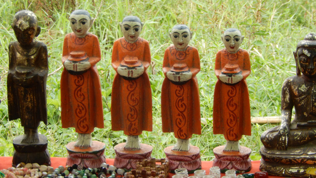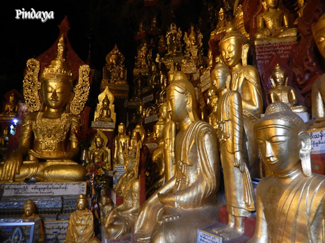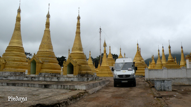 In der Früh weckt uns eine Glocke. Es ist ein Novize, der mit seinem Geläute ankündigt, dass nun die Mönche durch die Straßen gehen und bereit sind, die Nahrungsspenden der Bevölkerung, meist Reis, entgegenzunehmen. Die Mönche marschieren barfuß und im Gänsemarsch, jeder trägt eine metallene Reisschale. Wir machen einen Spaziergang durch den Markt von Kalaw. Es ist eine bunte Mischung von Obst- und Gemüse-, Fleisch- und Fisch-, Gemischtwaren- und Souvenirständen. Witzig finden wir grüne Früchte, die wie Buddhas aussehen. Fisch ist meist getrocknet und teils kunstvoll tranchiert. Reis wird in verschiedenen Qualitäten in Tonnen angeboten. Auf der Fahrt nach Pindaya fahren wir durch fruchtbares Hochland, eben werden Karfiol und Kraut geerntet. In Pindaya sehen wir uns die berühmte Höhle der 8.000 Buddhas an. Es ist eine Tropfsteinhöhle, in der über Jahrhunderte bis heute Buddhastatuen aufgestellt wurden. Mit einem Fahrstuhl geht es hinauf zum Höhleneingang. Von hier hat man einen schönen Blick über den kleinen See von Pindaya und eine Anlage mit Dutzenden goldenen Stupas. In der Höhle ist es teilweise ein wenig eng, weil Statue an Statue steht, also nichts für Leute mit Platzangst. Die allermeisten Buddhas sind vergoldet und glänzen im Schein einiger Scheinwerfer. Im tiefer gelegenen Teil der Höhle ist es recht schwül. Leider ist die Besichtigung nichts für Susi, denn sie ist zunehmend von Schmerzen geplagt, die ihr ihr Bandscheibenvorfall verursacht. Wir haben schon vor Tagen einen Operationstermin sofort nach unserer Rückkehr terminisiert. Auf der Weiterfahrt zum Inle-See beginnt es zu regnen. Hoffentlich hält das Schlechtwetter nicht an, denn morgen ist eine längere Bootstour geplant. Km 145/3.221/41.843.