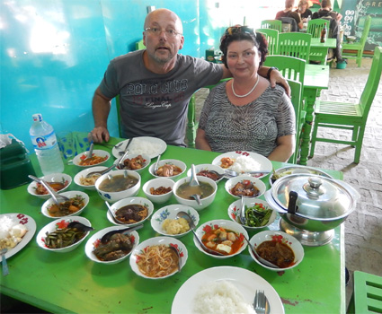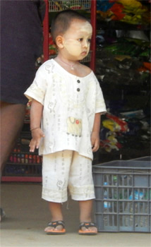 Um 7 Uhr startet der zweite Tag der Rallye. Wir hatten ja mit zwei Agenturen verhandelt, die Reisende mit ausländischem Fahrzeug in Myanmar begleiten. Dabei ist es interessant, dass die Agentur, mit der wir nun reisen (Burma Senses), ein sehr umfangreiches 14-tägiges Programm vorgeschlagen hat, von dem die andere Agentur (Myanmar Expert Travel & Tours) behauptet hat, dass es nicht durchführbar sei. Damit konfrontiert, sagte Burma Senses, dass dieses Programm bei entspannter Fahrweise noch genug Zeit für Besichtigungen lasse. Wir waren sehr skeptisch, mussten uns dann aber für die Rallye-Agentur entscheiden, da bei ihr schon unsere jetzigen Reisegefährten gebucht hatten, was die Kosten reduzierte, während Myanmar Expert Travel & Tours, die ein wesentlich schmäleres Programm für 14 Tage angeboten hätte, noch keine Reisepartner für uns in Aussicht hatte. Angesichts der heutigen langen Fahrtstrecke habe ich gestern vorgeschlagen, bei Dämmerung um 6 Uhr zu starten anstatt um 7. Doch das wollen die Leute von der Agentur nicht. Ergebnis: Es ist ein Jammer. Wir fahren ganzen Tag, fahren unmittelbar an tollsten Sehenswürdigkeiten vorbei und fahren trotzdem eine Stunde in die Nacht hinein. Aber vielleicht im Detail: Es geht über zwei Gebirge, die Straße ist schlecht. Es geht nur mühsam voran. Dann fällt auch noch unser Turbo aus. Ich denke mir, vielleicht hilft, so wie damals in Tibet, ein wenig Herumfummeln, aber das Teil ist so heiß, dass ich mir gleich die Finger verbrenne. Es kühlt auch ganzen Tag nicht ab, ich muss das also morgen in der Früh wieder versuchen. Steigungen bewältigt der Zerberus nunmehr nur mehr sehr langsam, doch wir können auf der Ebene wieder aufholen, so dass wir den Konvoi kaum aufhalten. Zum Mittagessen in Monywa gibt es ein phantastisches Buffet bei Tisch. Es kommen zirka 20 Schalen mit Essen auf den Tisch, wenn eine leer ist, kommt nach. Herrlich! Viele Frauen und Kinder haben weißes Make-up, das aus einem bestimmten Holz gewonnen wird, im Gesicht. Es soll vor Sonne schützen, wird aber vor allem wegen der Schönheit aufgetragen. Außerhalb der Stadt sehen wir uns die beiden Riesen-Buddhas an. Der stehende Buddha ist schon aus einigen Kilometern Entfernung zu sehen, vor ihm befindet sich ein zweiter liegend. Weiters gibt es jede Menge Stupas und Tempel. Die Besichtigung beschränkt sich aus Zeitgründen jedoch auf einen Fotostopp in 500 Metern Entfernung. Auf der Fahrt zu und von den Buddhas passieren wir die beeindruckende Tempelanlage von Thanboddhay. Wir fahren einfach dran vorbei. Das meine ich mit: Es ist ein Jammer. Die Straße bis Mandalay ist meist recht gut und wir kommen gut voran, nur beim Überholen fehlt halt der Turbo. Aus Zeitgründen muss dann leider die Besichtigung der eineinhalb Kilometer langen U-Bein-Brücke entfallen. Ein Jammer. Erst bei Dunkelheit erreichen wir Mandalay. Bei starkem Verkehr ist es sehr schwierig, unserem Agenturfahrzeug zu folgen. Unser Reiseleiter kümmert sich nur wenig, ob alle nachkommen und so ist es kein Wunder, dass die halbe Gruppe verloren geht. Km 360/2.806/41.427.
