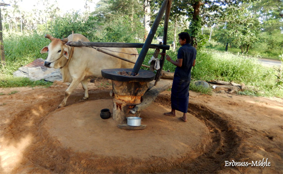 Am Vormittag können wir uns ansehen, wie Palmöl hergestellt und Erdnüsse in einer vom Ochsen angetriebenen Mühle gemahlen werden. Gleich neben dem Mount Popa, einem erloschenen Vulkan, der weithin sichtbar aus der Ebene ragt, befindet sich ein kleiner Berg in Form eines steilen Kegelstumpfes, auf dessen Plateau buddhistische Tempel und Stupas thronen: Der Popa Taung Kalat. Er lässt sich über dreihundertsiebzig oder so Stufen besteigen, barfuß natürlich, weil's ja eine Tempelanlage ist. Eine schweißtreibende Angelegenheit, denn es hat wieder jenseits der 30 Grad und es ist wieder heftig schwül. Zudem wird man von dreisten Affen belästigt. Von oben bietet sich ein weiter Blick über die Ebene, das Schönste aber ist der Blick von der Flanke des Mount Popa auf den Popa Taung Kalat. Die weitere Fahrt nach Magwe verläuft unspektakulär. Km 181/3.786/42.408.