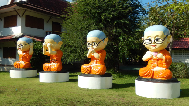 Wir verbringen den Vormittag recht gemütlich im Schatten alter Bäume bei einem Kloster. Zu Mittag gibt es Lammeintopf aus der Mongolei. Sehr gewöhnungsbedürftig. Muss aber sein, da die Dosen sonst ablaufen. Am Nachmittag starten wir eine Rundfahrt durch das westlich von Chiang Mai gelegene Mae-Sa-Tal. Zunächst säumen Wohnhäuser und Villen die Straße, dann passieren wir Hotels und Resorts en masse und schließlich geht es durch Urwald, der allerdings von reichlich Gärten unterbrochen ist, die Berge hinauf. Die Gegend ist landschaftlich wesentlich reizvoller als der Doi Inthanon-Nationalpark, durch den wir gestern und vorgestern gefahren sind. Gelegentlich begegnen uns Arbeitselefanten. Da kostenlose Nachtplätze nicht zu finden sind, übernachten wir auf dem Gelände des Botanic Resort (150 Baht). Km 112/5.685/44.306.