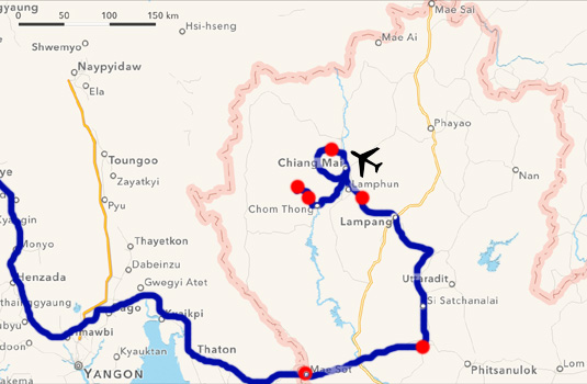 Auf thailändischer Seite erfordert der Fahrzeugimport Geduld. Zuerst müssen wir ein Formular ausfüllen, das ganz offensichtlich für die Luftfahrt gedacht ist: Passenger-List, Crew-List, Callsign. Wie schon erwartet, erhalten wir eine nur 30-tägige Importerlaubnis für das Auto. Jeder Tag Überschreitung wird mit 1.000 Baht (26 Euro) geahndet. Der Zollwert des Autos wird mit 4,5 Millionen Baht (118.000 Euro) festgelegt. Angeblich kann man die Frist auf jedem Zollamt verlängern. Nach zwei Stunden sind auch die thailändischen Einreiseformaltiäten erledigt. Die vier Motorradfahrer, die ab nun ihre eigenen Wege gehen, fahren ohne ein Wort des Abschieds an uns vorbei. Wir sind uns in den letzten zwei Wochen nicht besonders nahe gekommen, weil deren Schweißgeruch für uns oft unerträglich war. Jeden Tag im selben Motorradanzug bei großer Hitze und das über Monate erzeugt einen speziellen Geruch. In Thailand wird wieder links gefahren. Wir campieren zusammen mit Annette, Stefan, Claire und Emiel außerhalb von Mae Sot auf einer Wiese. Km 151/4.879/43.502.