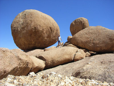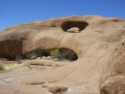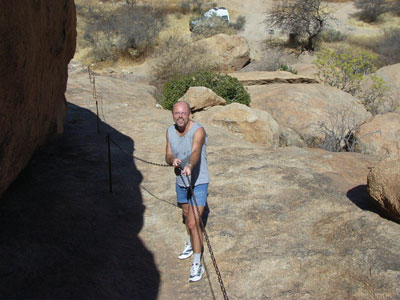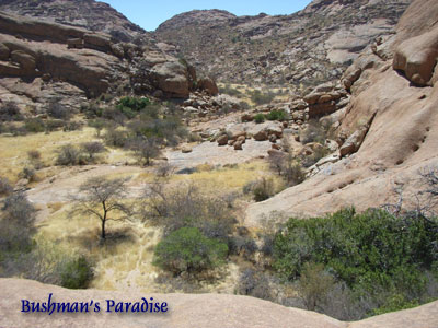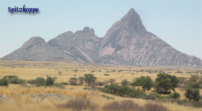 Samstag, 26. September 9, Tag 4, Spitzkoppe Zunächst geht es steil den Bosua-Pass hinunter, dann ist bald Karibib erreicht. Hier gibt es ein Internet-Cafe, doch es gibt keinen Netzkabeladapter, damit mein Notebook an die Steckdose kann. Ich stelle das ganze Auto auf den Kopf, finde dennoch meinen nicht. Ich hab aber Glück, in einem Laden gibt es einen, der dann noch ein wenig mit dem Stanleymesser bearbeitet werden muss, damit er passt. Das ist nicht die einzige Panne im Zusammenhang mit dem Computer. Schon gestern hab ich festgestellt - ich könnte mich ohrfeigen -, dass ich kein 12-V-Netzgerät für das Notebook mithabe. Ich hätte schwören können, ich hätte im Februar eines im Auto gelassen und hab daher diesmal keines mitgenommen. So ein Mist: Ich bin jetzt auf 220-V-Steckdosen angewiesen. Beim Mittagessen in einem Restaurant in Usakos hängt es schon an der Leitung. Nun geht es zur Großen Spitzkoppe, einem markanten Berg, der sich aus der Ebene erhebt und an das Matterhorn erinnert. Hier soll es tausende von Felsmalereien geben. Man bezahlt 35 NAD = 3,30 EUR per Person und 10 NAD = 1 EUR für's Auto. Dann kann man um und zwischen den Felsbergen herumfahren. Es gibt sehr beeindruckende Felsformationen. Hauptattraktion ist das Bushman's Paradise. Um dorthin zu gelangen, muss man etwa 150 Meter auf einem glatten Felsen hinaufsteigen, als Hilfe ist eine Kette angebracht. Oben erwartet einen eine grüne Oase umgeben von Felswänden, dort und da finden sich auch ein paar Felsmalereinen, aber in schlechtem Erhaltungszustand. Dennoch hat sich der Aufstieg sehr gelohnt, es ist einfach ein unbeschreiblich schöner Ort, von dem man noch dazu eine tolle Aussicht auf die darunter liegende Ebene und die Nachbarberge hat. Nach einer Rundfahrt durch die Felsberge fahre ich noch weiter bis Uis und dann noch ein Stück Richtung Brandberg. Als mir sechs oder sieben Männer entgegen kommen, die ihr Auto schieben, weil die Batterie leer ist, leiste ich Starthilfe und ernte dafür ein dankbares Gejohle. Kurz vor dem Brandberg übernachte ich einen Kilometer neben der Piste im trockenen Savannengras. Hier im Damaraland gibt es erfreulicherweise kaum Zäune. Km 364/754/24.830. |