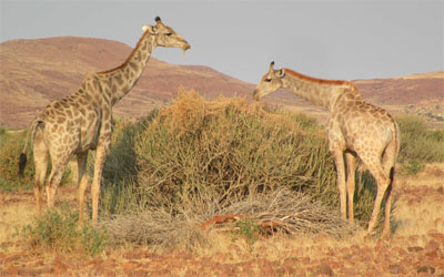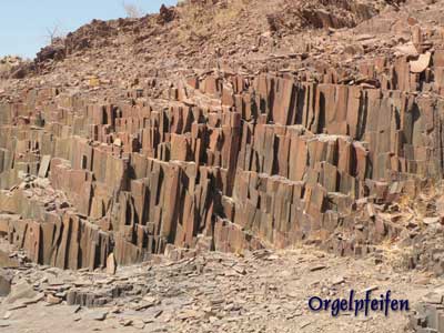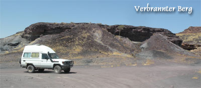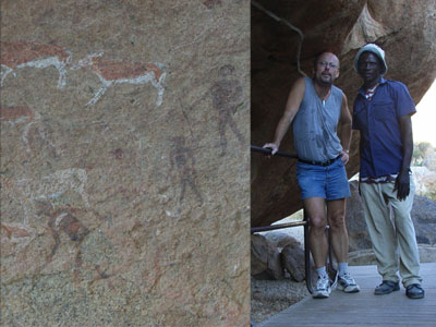 Sonntag, 27. September 9, Tag 5, Brandberg, Twyfelfontein Schon bei Sonnenaufgang stehe ich am Brandberg am Gate. Es ist auch schon ein Führer da, die Kassa ist noch unbesetzt. Der Führer heißt Petrus und legt ein ordentliches Tempo vor. Ich kann zwar gut mithalten, aber obwohl es noch ziemlich kühl ist, komme ich mächtig ins Schwitzen. Nach gut einer halben Stunde haben wir das Ziel, Felsmalereien, erreicht. Die berühmte White Lady ist leider nicht so besonders gut erkennbar, zuviele Touristen haben zur Erhöhung des Kontrastes auf den Fotos verschiedene Flüssigkeiten über die Lady geleert. Am Rückweg erzählt Petrus, dass er verheiratet ist und vier Kinder hat. Drei davon gehen noch zur Schule in Uis und weil das weit weg ist, bleiben sie von Montag bis Freitag dort Am Wochenende kommen sie heim und tun nichts anderes als essen, sagt er. Das Schulgeld ist sehr hoch, für jeden Schüler muss er 150 NAD = 14,30 EUR jährlich bezahlen. Erst jetzt, als wir zurück sind, kommen die nächsten Besucher, die jetzt schon in der prallen Sonne gehen müssen. Ich bezahle nachträglich 25 NAD = 2,40 EUR und gebe Petrus die gleiche Summe für seine interessante Führung. Nun geht's weiter zu den Orgelpfeifen, das sind bis zu drei Meter hohe Basaltsäulen ein paar Kilometer südöstlich von Twyfelfontein. Nur ein kurzes Stück davon entfernt ist der Verbrannte Berg gelegen, ein Hügel aus schwarzem Gestein, der wirklich wie verbrannt aussieht. Nun ist es Mittag und ich leiste mir den Luxus eines Mittagessens in der Twyfelfontein Country Lodge (S20 34.219 E14 22.214). Es ist ein Buffet mit kalten Vorspeisen und zwei warmen Hauptgerichten, Kuchen, Obst und Kaffee angerichtet (125 NAD = 12 EUR). Die luxuriöse Lodge ist am Rande eines Felsabbruches gelegen und von der Speiseterasse bietet sich ein herrlicher Blick auf die Tiefebene. Nun sehe ich mir die nahe gelegenen Felsmalereien von Twyfelfontein (S20 35.450 E14 22.325) an (30 NAD = 2,90 ΕUR p.P. und 10 NAD = 1 EUR für's Parken). 20 NAD = 1,90 EUR gebe ich dem Führer. Als ich sage, dass ich aus Österreich komme, sagt er auf Wienerisch "Geh schleich di". Er kann auch "gemma gemma" und "hearst Oida". Die Felsbilder hier sind besser erhalten und zeigen interessanterweise neben hier heimischen Tieren auch Robben und Pinguine. Eine Felswand könnte eine Lehrtafel gewesen sein, sie zeigt die Fußabdrücke verschiedener Tiere. Nun fahre ich noch zum Petrified Forest. Drei Versteinerte Wälder sind im Reiseführer angegeben. Da ich wieder zurückfahren muss, besuche ich gleich den ersten (den westlichsten S20 26.809 E14 27.287), der ist allerdings ein wenig mickrig. Ja es gibt schon ein paar längere Baumstämme und jede Menge Kleinholz, aber von einem Wald oder gar übereinanderliegenden Stämmen ist nicht die Rede. Mehrere Welwitschias gibt's zu sehen. Eintritt stolze 20 NAD = 1,90 EUR p.P. plus 10 NAD = 1 EUR für den Parkplatz. Der Führer ist über zwei Äpfel hocherfreut. Nun möchte ich den verbleibenden späten Nachmittag nützen, noch ein ordentliches Stück in den Norden zu kommen. Bei einer Veterinärkontrolle in der Nähe der Palmwag Lodge bemerke ich, dass ich einen Platten kriege. Es ist ein Hinterreifen, also ein neuer. Ich wechsle schnell das Rad, möchte nun aber nicht mehr recht weit fahren, weil ich nun ja zwei verschieden große Reifen an der Antriebsachse habe. Bei nächster Gelegenheit fahre ich von der Straße und finde in einiger Entfernung einen akzeptablen Nachtplatz. Der Reifen ist schnell geflickt, morgen sehe ich, ob er auch dicht ist. Außerdem habe ich gestern begonnen, jeden Abend ein Stück alter Sünden aus dem Sudan abzubüßen: Dort bin ich ja auf einer frisch asphaltierten Straße gefahren und seither ist unser Auto bis zum Dach (!) voller Asphaltflecken. Diesmal hab ich einen Teerreiniger mit und mit dem reinige ich jeden Abend ein Stück der Karosserie. Außerdem repariere ich heute den Sonnenschirmständer, ich habe ein passendes Ersatzteil mit. Kurz vor Sonnenuntergang kühlt es enorm schnell ab. Wars zuerst noch oben ohne angenehm, brauch ich eine halbe Stunde später den Anorak. Heute ist es windstill und daher absolut ruhig. Km 330/1.084/25.160. |