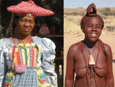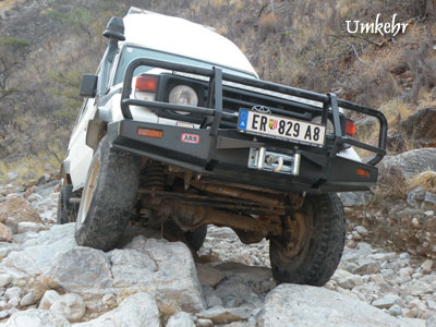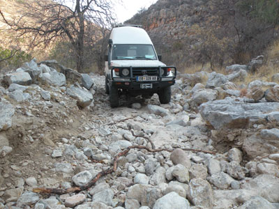 Montag, 28. September 9, Tag 6, Robbies-Pass Was für ein Tag! Es gibt nur ein Wort dafür: Unbeschreiblich. Doch von vorne: Es fängt alles bestens an. Der reparierte Reifen ist dicht. Dann laufen mir gleich auf der Hauptstraße nach Sesfontein ein paar Zebras, Giraffen, ein Oryx und jede Menge Antilopen über den Weg. An einem Stand an der Straße kaufe ich ein paar Herero-Puppen. In Sesfontein gibts keinen Diesel, macht nichts, muss ich halt irgendwann Opuwo ansteuern. An einer Straßenküche esse ich schon am Vormittag Fleisch aus dem Kessel. Brot gibt es keines, dafür "gebackene Mäuse". Schon bei meinem letzten Aufenthalt im Kaokoveld hat mich der auf der Baedeker-Karte eingetragene Robbies-Pass neugierig gemacht. Die Karte zeigt eine Straße##, die von Sesfontein über den Pass direkt nach Norden nach Kaoko Otavi führt und gibt 92 Kilometer an. Doch im Ort zweigt nirgendwo eine Straße ab. Nachdem ich mehrmals gefragt habe und niemand den Pass kannte, will ich schon umdisponieren und Richtung Purros fahren, doch da sehe ich wenige Kilometer außerhalb von Sesfontein einen Abzweig nach Norden. Ich fahre die Straße rein, sie führt zu einem Camp, doch eine dünne Spur führt weiter, zunächst einen Berg hinauf, dann drüben sehr steil runter, es ist sehr steinig, dann geht es durch ein trockenes steiniges Flussbett und dann wieder eben dahin. Plötzlich münde ich in eine relativ breite Schotterstraße ein. Erst einige Zeit später wird mir klar, dass dies wieder die Straße von Sesfontein nach Purros ist, die einen großen Bogen beschreibt. Die Abkürzung, die ich gemacht habe, hat sicher fünfmal so viel Zeit benötigt, als die Hauptstraße. Also ist nichts mit dem Pass und es geht doch nach Purros. Nach kurzer Fahrt kommt ein Wegweiser (S19 04.600 E13 32.511) mit der Aufschrift "Otjikondavirongo Primary School 41 km". Dieses Dorf ist auf der Karte etwa in der Mitte zwischen Sesfontein und Kaoko Otavi, kurz vor dem Robbies-Pass verzeichnet. Also doch Pass! Anfangs ist die Piste noch halbwegs zügig befahrbar, doch sie wird zunehmend schlechter. In einem Hererokral (S18 54.418 E13 32.185) halte ich. Es scheint nur in einer kleinen Hütte jemand zu sein, doch ich bin erstaunt, wie viele Frauen und Kinder da herauskommen. Die Damen wollen zuerst nicht fotografiert werden, doch als ich ihnen ein paar Kartoffeln schenke, darf ich. Die Erdäpfel werden interessiert beäugt, sowas haben die Frauen noch nicht gesehen. Ich versuche zu erklären, dass man die Dinger kochen muss vor dem Essen, aber keine versteht mich. Erst als ich eine Kartoffel in den Topf am Feuer schmeiße, kennen sie sich aus. Wir haben dann noch eine Menge Spaß, als eine der Frauen Fotos mit meiner Kamera machen darf. Otjikondavirongo (S18 45.669 E13 32.293) besteht eigentlich fast nur aus der Schule. Nur ein paar unbewohnte Hütten stehen im Respektabstand. Eine Menge Kinder spielen vor der Schule. Als ich nach dem Robbies-Pass frage, verstehen sie mich nicht und holen den Lehrer. Der kennt den Pass auch nicht und meint, der Weg nach Kaoko Otavi führt über Sesfentein. Als ich nachhake, meint er, es gäbe schon noch einen anderen auch noch, aber da fährt kaum jemand, weil so viele Steine sind. Er gibt die Fahrzeit mit 4 Stunden an. "Fährt kaum jemand" und "viele Steine" macht mich jetzt erst recht neugierig auf den Pass. Zuerst geht es allerdings ziemlich eben dahin, immer wieder sind trockene Bach- und Flussbetten zu durchqueren, teils geht es recht steil runter und rauf. Bei einer solchen Bachbettquerung sitze ich mit der hinteren Stoßstange auf und die Räder drehen trotz Allrad durch. So kommt die neue Seilwinde zu ihrem ersten Einsatz. Funktioniert bestens, gleich bin ich draußen. Es dauert halt eine Weile, bis das Seil wieder anständig auf der Rolle ist, Handschuhe und Bedienteil ordentlich verstaut und die Hände gewaschen sind. 200 Meter später das gleiche wieder. Diesmal klappt es aber erst auf den dritten Versuch, denn die ersten zwei Bäume sind im Nu entwurzelt. Nun wird der Weg immer steiniger, die Steine immer größer und dann dreht der Weg in ein enges Tal hinein, an dessen Ende der Pass sein muss. Nun geht es nur mehr mit Allrad im ersten Gang und Untersetzung, maximal im Schritttempo. Die Steine, über die es drüber geht, werden immer größer, mehrmals steige ich aus, um zu überlegen, wo es drüber gehen könnte. Zudem wird der Baum- und Buschbestand immer dichter, sodass mein Buschmesser mehrmals zum Einsatz kommt, aber dennoch mein Toyo viele Kratzer einstecken muss. Schon bin ich am Zweifeln, dass der Weg überhaupt befahrbar ist, dass das überhaupt ein Weg ist. Doch auf den kurzen sandigen Abschnitten sind vereinzelt Reifenspuren erkennbar. Da ist also schon mal jemand gefahren. Also weiter! Als ich ein längeres Stück im Flussbett über riesige Steine hopple, kommt mir ein Eselsgespann entgegen. Jetzt ist es mir klar, wo die Reifenspuren herkommen. Der kleine Wagen hüpft leicht überall drüber. Der Lenker des Eselkarren kann leider kein Englisch außer "smoke". Ich fahre weiter und es wird immer schwieriger, manschmal sitze ich schon mächtig auf den Steinen auf. Mehrmals denke ich ans Umkehren, doch jedesmal, wenn ein Platz kommt, an dem man umdrehen könnte, geht's wieder ein Stück leichter voran. Als ich dann an eine Stelle komme, wo ich glaub, ich komm unmöglich drüber, will ich zurückschieben, doch das geht keinesfalls, weil ich nicht sehe, wo ich hinfahre. Also nach vorne! Ich schwöre, wenn ich da drüber komm, dann dreh ich bei nächster Gelegenheit um und kapituliere vor dem Robbies-Pass. Und ich komme drüber. Dann kommt auch ein Platz (S18 39.298 E13 31.584), der grade groß genug zum Wenden ist und nun die ganze Tortur nochmals, ich bin von der Schule etwa 15 Kilometer entfernt und habe dafür fast drei Stunden benötigt. Ich schwitze wie ein Irrer, denn schon vor ein paar Stunden ist die Klimaanlage ausgefallen. Ich hab auch schon unter der Motorhaube nachgeseh