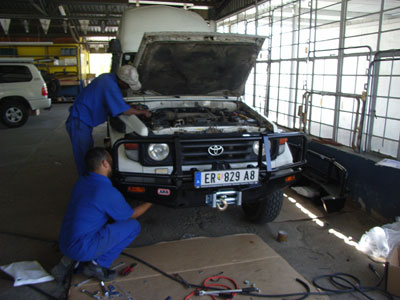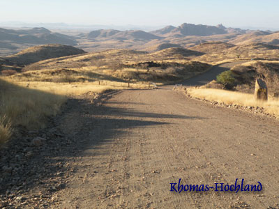 Halbwegs ausgeschlafen steige ich aus dem Flugzeug. Die Passformalitäten verlaufen unkompliziert, aber langsam. Dafür ist mein Gepäck gleich da und auch mein Abholer wartet schon auf mich. Mein Landcruiser steht schon ungeduldig vor der Farm. Leider ist trotz regelmäßigen Ladens eine der drei Autobatterien kaputt. Ich kann mir eine ausleihen; mit der springt der Wagen sofort an. Ich verstaue mein Gepäck und fahre nach Windhoek, wo ich gleich die Werkstätte aufsuche, die dem Toyo morgen eine Seilwinde einbauen wird. Die Winde und eine neue Stoßstange mit Bullbar sind bereits eingetroffen. In einer nahen Reifenwerkstätte kaufe ich zwei neue Reifen, sodass nunmehr alle vier Räder die gleiche Größe aufweisen, nur das Reserverad ist noch eines von denen, mit denen ich von zu Hause weggefahren bin und die eine Dimension größer waren. Während der Reifenmontage repariere ich eine Schlauchverbindung unserer Wasserversorgung, die kaputtgegangen ist. Nun macht auch noch das Zündschloss Ärger: Der Zündschlüssel geht von Mal zu Mal schwieriger rein. Sieht aus, als würde ich ein neues Schloss brauchen. Eine große Toyota-Werkstatt könnte in vier Werktagen eines da haben, das ist wenig hilfreich. Ich frag mich zu Lock&Key durch und hier gibt es Soforthilfe und die noch dazu gratis: Der freundliche Besitzer streut Graphit ins Schloss und nach ein paarmal Schlüssel rein, Schlüssel raus ist das Problem behoben! Eine gleich große Batterie mit gleicher Leistung wie die kaputte zu finden, ist schwierig. Erst als ich Abstriche bei der Leistung mache, krieg ich eine. Nun schließe ich noch eine Autohaftpflichtversicherung ab (Forbes Insurances im Carl-List-Haus), die auch in Botswana und Südafrika und einigen weiteren Staaten gilt. Leider ist die Mindestversicherungsdauer 1 Jahr (naja ich komm ja eh wieder mal dann und wann) und sie kostet 671 NAD = 64 EUR. Morgen kann ich die Polizze abholen. Nach einem Großeinkauf in einem Supermarkt fahre ich zurück zur Farm und will die geliehene mit der gekauften Batterie austauschen. Doch die neue ist um fast vier Zentimeter zu lang und passt nicht in die Halterung. Ich sehe mir den Zettel mit den von mir aufgeschriebenen Maßen an und stelle fest, es ist der Fehler des Händlers, er hat mir eine falsche Batterie gegeben. Da muss ich morgen umtauschen fahren und nochmals die 40 Kilometer zurück zur Farm um die geliehene Batterie zurückzugeben. So ein Mist, ich will ja endlich in den Norden rauffahren! Ich nächtige auf dem Campingplatz der Farm. Km 115/115/23.801. Freitag, 25. September 9, Tag 3, Khomas Hochland Pünktlich um 8 treffe ich im Offroad-Center in der Diehlstraße ein. Während die neue Stoßstange und die Seilwinde montiert werden, bringe ich die Batterie ins Geschäft zurück. Leider haben sie keine passende und ich krieg mein Geld zurück. Als ich die Batterie vom Taxi ins Geschäft trage, laufen ein paar Tropfen Batteriesäure aus und ätzen mir sofort ein großes Loch ins Hemd. Im nächsten Geschäft haben sie eine Batterie mit den gewünschten Maßen, doch die Pole sind falsch. Da ich die Kabel recht lang in Erinnerung habe, nehm ich sie und bringe sie zum Offroad-Center. Doch das Plus-Kabel ist um einen Zentimeter zur kurz, die Batterie lässt sich nicht anschließen, also die Batterie wieder zurück ins Geschäft gebracht. Nun klappere ich alle Autozubehörgeschäfte in Windhoek ab, doch eine Batterie, wie ich sie brauche, gibt es nicht. Ich nehm also die nächst kleinere mit entsprechender Polung, die hat anstatt 100 nur 65 Ah, aber es hilft nichts, ich brauch eine, weil ich die geliehene zu Mittag zurückbringen muss. Zwischendurch hole ich die Versicherungspolizze ab. Um kurz nach 12 sind alle Arbeiten am Auto erledigt. Stoßstange und Winde kosten etwa soviel wie in Österreich, die Montage (2 Arbeiter, je 4 Stunden) macht allerdings nur 600 NAD = 57 EUR aus. Nachdem ich nun endlich die geliehene Batterie zurückbringen kann, geht's nun endlich raus in den Busch. Ich fahre von Windhoek nach Westen durch das Khomas-Hochland, ein von Büschen und Savannengras bestandenes Hügelland. Entsprechend ist auch die Straße, später Piste, kurvig und bergauf, bergab führend. Wild gibt es keines zu sehen, das Land ist eingezäunt. Bald komme ich zum Stillstand, weil der Dieselfilter ziemlich plötzlich verstopft ist. "Zufällig" hab ich einen neuen dabei. Ich passiere die Missionsstation Baumgartsbrunn (S22 36.517 E16 47.004), das Liebig-Haus (S22 36.506 E16 43.170), ein ca. 100-jähriges, mitten in der Einöde stehendes dreistöckiges Haus, das schon seit langem nicht mehr bewohnt ist und langsam verfällt, und die von den Schutztruppen erbaute Francois-Feste (S22 40.022 S16 37.113), eine unspektakuläre Ruine, von der man allerdings einen schönen Ausblick auf die umgebende Hügellandschaft hat. Ich übernachte auf dem Bosua-Pass (S22 41.537 E16 02.559)neben der Piste. Km 275/390/24.076. |