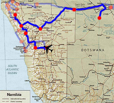 Dienstag, 29. September 9, Tag 7, Palmwag-Lodge Für die beiden schwierigen Bachdurchfahrten brauch ich aus dieser Richtung die Seilwinde nicht, dafür dellt es mir bei der zweiten Durchquerung den Dieseltank mächtig ein. Dann kommt wieder die Schule, das Dorf, dann lange nichts und dann endlich die Einmündung in die Piste nach Sesfontein. Irgendwie hab ich die Rüttelei echt satt und ich beschließe, nicht durch die Himbadörfer auf lausigen Pisten, sondern auf der Asphaltstraße nach Nordosten zu fahren. Dazu muss ich zunächst bis nach Palmwag zurückfahren. Plötzlich lässt sich das GPS-Gerät nicht mehr bedienen, es reagiert auf keinen Knopfdruck. Gut, dass ich noch eins mithab. In Sesfontein gibt es heute wieder Diesel. Zu Mittag komm ich zur Palmwag-Lodge (S19 53.133 E13 56.219), wo ich ein prima Oryx-Steak esse (dieses, ein Bier und ein Kaffee 95 NAD = 9 EUR). In Kamanjab beginnt endlich die Asphaltstraße, jetzt lässt sich's rüttelfrei brausen. Die weitere Landschaft ist unspektakulär. Leider ist die Klimaanlage zeitweise nicht willig. Ich spanne noch einmal den Keilriemen nach, dann funktioniert sie wieder eine Weile, später muss ich wieder das Fenster runterkurbeln, damit es einigermaßen erträglich ist. In Outjo lasse ich die Klimaanlage in einer deutschen Werkstätte ansehen. Die können aber keine Ursache finden und nehmen 80 NAD = 7,60 EUR. Man empfiehlt mir, den Boschdienst in Otjiawarongo aufzusuchen. Bis dahin sind es noch 65 Kilometer, das schaffe ich noch, dann ist es ohnehin Abend. In Otjiawarongo finde ich ein Internetcafe und frage den Besitzer, ob er mir einen Platz zum Übernachten empfehlen könnte. Er meint, er hätte da ein nettes Plätzchen, lässt mich fünf Minuten warten, bis er Sperrstude hat und fährt mit mir zu sich nach Hause, wo er mir in einem schmutzigen Garten einen Platz zuweist. Zwei unappetitliche kleine Hunde springen an mir hoch, außerdem ist es laut. Ich frag ihn, wieviel er für die Übernachtung verlangt und er meint, ich soll ihm morgen geben, was ich mir denke. Das will ich nicht, er soll sagen, was er kriegt. Da meint er ganz jovial, wenn ich ihm 100 NAD = 9,55 EUR gebe, wärs schon in Ordnung. Ich übernachte auf dem bewachten Akacia-Camp (S20 27.935 E16 39.247), wo es ruhiger ist, hab Strom, Dusche und Toilette, um 65 NAD = 6,20 EUR. Leider ist nichts mit gemütlich draußen Sitzen, weil es regnet. Km 539/1.809/25.885. |