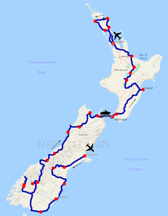 Vom 6. bis 8. Feburar fliegen wir nach Neuseeland. Nein, es handelt sich nicht um einen Ultra-Kurztrip, sondern schon der Hinflug dauert so lange und dazu kommt noch die 12-stündige Zeitverschiebung: Wir fliegen am Abend in München weg und kommen nach einem dreistündigen Aufenthalt in Dubai am übernächsten (!) Tag am Nachmittag in Christchurch an. Weit unter uns: Österreich. Weit über uns: das Ozonloch. Mit einem gemieteten Wohnmobil erkunden wir im neuseeländischen Sommer, in dem es nicht immer heiß ist, aber oft die Sonne erbarmungslos durch die Kleidung brennt, zunächst die aufregende Südinsel mit himmelblauen Flüssen und Seen, Fjorden, Sandstränden und gletscherbedeckten Bergen. Die Autofähre bringt uns in vier Stunden durch die Cook-Straße auf die Nordinsel, wo Neuseelands schönste Stadt, Vulkane, Geysire und bunt schillernde Seen auf uns warten. Als es nach fünf Wochen und 4.600 Kilometern von Auckland wieder nach Hause geht, sind wir nicht im Stande, die wichtigste der wichtigen Fragen zu beantworten: Welche Insel ist schöner, die Nordinsel oder die Südlinsel?