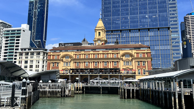 Auckland ist irgendwie eine fade Stadt ohne spezielle Sehenswürdigkeiten, vom Ferry Building vielleicht abgesehen. Zwei Tage hier sind definitiv zu lang. Kleiner Planungsfehler! Wir stehen spät auf und gehen eine größere Runde die Kais entlang, fahren dann mit der Fähre nach Devonport, das an der Meeresbucht Auckland gegenüberliegt und essen dort gut (und scharf!) koreanisch. Von der Fähre hat man einen schönen Blick auf das ocker-braune Ferry Building vor der kleinen, modernen Skyline mit dem Sky Tower.