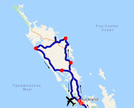 Naja. Für einen Strandspaziergang reicht das Wetter, aber wir sind noch nicht ganz zurück, fängt es schon wieder an zu nieseln. In Whangarei besuchen wir das irgendwie vertraut anmutende Hundertwasser Art Centre. Friedensreich hat ja die letzten Jahrzehnte seines Lebens im Norden Neuseelands verbracht und hat etliche Bauten im für ihn typischen Stil hinterlassen. Die großartige Ausstellung ist seinem Leben und Schaffen gewidmet und zeigt viele seiner Werke. Da wir noch keinen lebenden Kiwi gesehen haben - die Chancen stehen ja sehr schlecht, da Kiwis nicht nur selten, sondern auch nachtaktiv sind und wir nicht - machen wir einen Besuch beim "fabelhaften" Kiwihaus Kiwi North, das so nebenbei mit einem Museum und einen Heritage Park aufwartet. Im vielleicht 40 m2 großen und auf einer Längsseite verglasten Kiwihaus ist es sehr dunkel und erst nach längerem erspähen wir einen Kiwi. Details sind nicht zu erkennen, es ist stockdunkel. Beim Rausgehen fragt die Dame an der Kasse, ob wir einen Kiwi gesehen haben, und ich sage etwas enttäuscht: einen. Sie sagt, das ist ja großartig, und ich frage, wieviele sie denn haben und sie antwortet: zwei! Wir dachten echt, dass wir hier von jeder Art ein paar sehen: große, kleine, helle, dunkle, gefleckte, mit kurzem und welche mit langem Schnabel. Wir hatten anscheinend ganz vergessen, dass Kiwis selten sind. So ganz nebenbei sind dann auch noch das Museum und erst recht das Freilichtmuseum echt schwach. Kurvig geht es weiter nach Norden. Im winzigen Ort Whangaruru halten wir zum Kaffee und genießen die herrliche Lage an einer wunderschönen Bucht. Aber es kommt noch großartiger: Eine halbe Fahrstunde weiter sehen wir von einem Aussichtspunkt auf eine einsame Bucht mit hellem Sandstrand und türkisem Meer. Kaum zu glauben: Hier gibt es einen Campingplatz direkt am Strand, auf dem wir fast alleine sind. Außer einem weiteren Wohnmobil und ein paar Zelten ist hier nichts. Traumhaft! Weit und breit gibt es kein Licht und so ist der Sternenhimmel ein Wahnsinn! Km 120/4.097.
